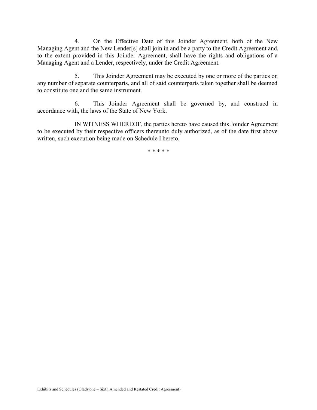 4. On the Effective Date of this Joinder Agreement, both of the New Managing Agent and the New Lender[s] shall join in and be a party to the Credit Agreement and, to the extent provided in this Joinder Agreement, shall have the rights and obligations of a Managing Agent and a Lender, respectively, under the Credit Agreement. 5. This Joinder Agreement may be executed by one or more of the parties on any number of separate counterparts, and all of said counterparts taken together shall be deemed to constitute one and the same instrument. 6. This Joinder Agreement shall be governed by, and construed in accordance with, the laws of the State of New York. IN WITNESS WHEREOF, the parties hereto have caused this Joinder Agreement to be executed by their respective officers thereunto duly authorized, as of the date first above written, such execution being made on Schedule I hereto. * * * * * Exhibits and Schedules (Gladstone – Sixth Amended and Restated Credit Agreement)