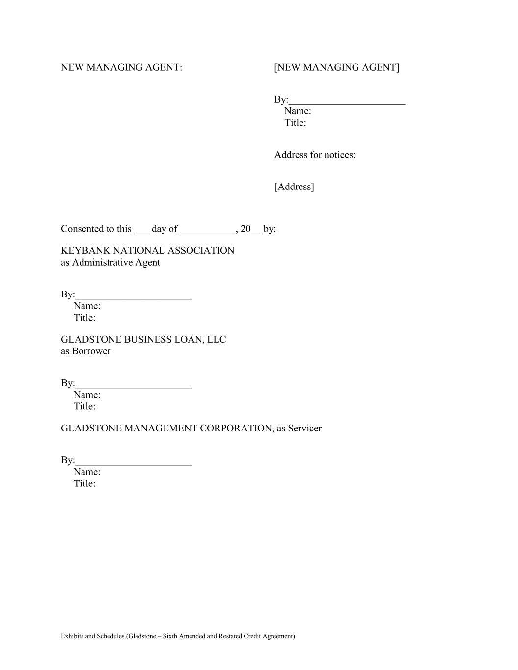 NEW MANAGING AGENT: [NEW MANAGING AGENT] By:_______________________ Name: Title: Address for notices: [Address] Consented to this ___ day of ___________, 20__ by: KEYBANK NATIONAL ASSOCIATION as Administrative Agent By:_______________________ Name: Title: GLADSTONE BUSINESS LOAN, LLC as Borrower By:_______________________ Name: Title: GLADSTONE MANAGEMENT CORPORATION, as Servicer By:_______________________ Name: Title: Exhibits and Schedules (Gladstone – Sixth Amended and Restated Credit Agreement)