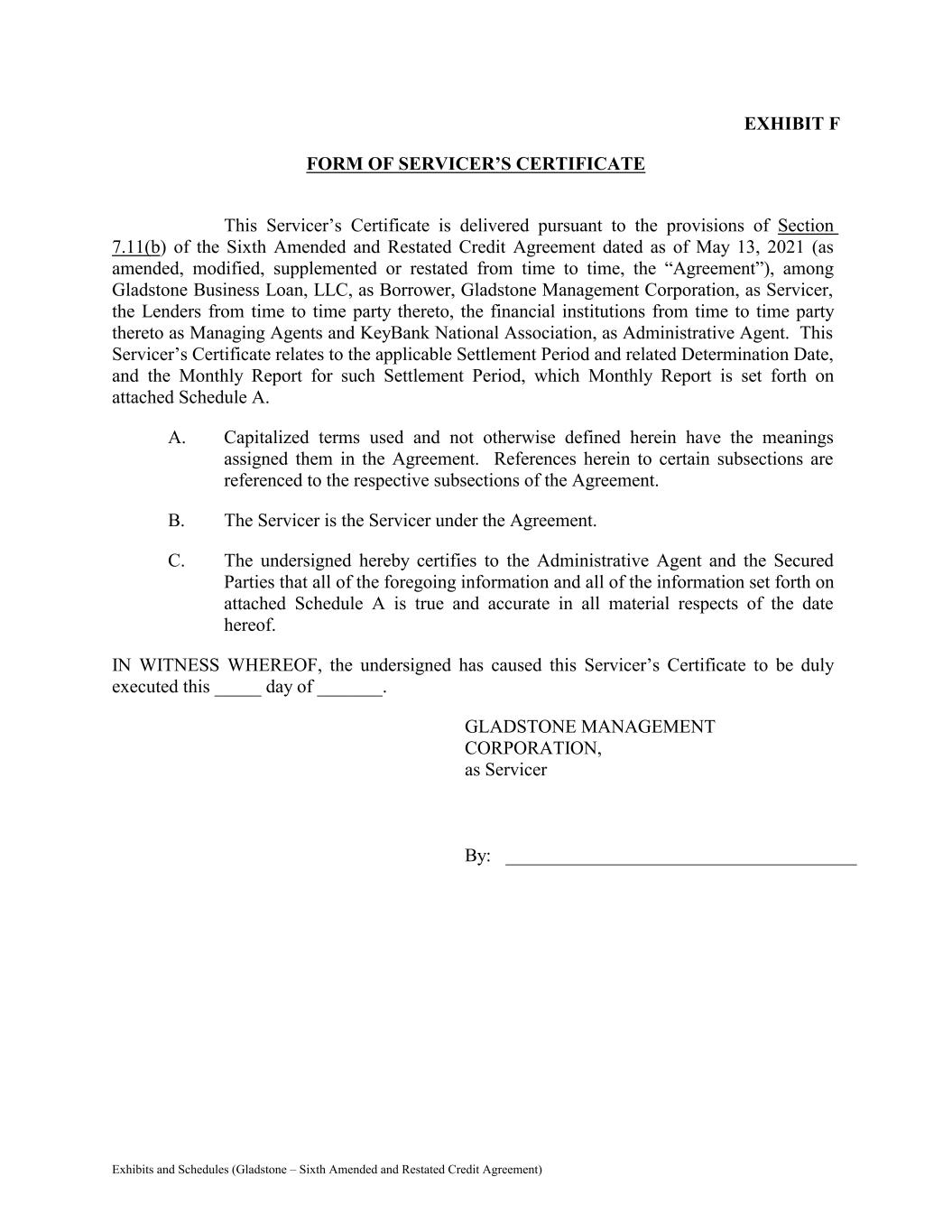 Exhibits and Schedules (Gladstone – Sixth Amended and Restated Credit Agreement) EXHIBIT F FORM OF SERVICER’S CERTIFICATE This Servicer’s Certificate is delivered pursuant to the provisions of Section 7.11(b) of the Sixth Amended and Restated Credit Agreement dated as of May 13, 2021 (as amended, modified, supplemented or restated from time to time, the “Agreement”), among Gladstone Business Loan, LLC, as Borrower, Gladstone Management Corporation, as Servicer, the Lenders from time to time party thereto, the financial institutions from time to time party thereto as Managing Agents and KeyBank National Association, as Administrative Agent. This Servicer’s Certificate relates to the applicable Settlement Period and related Determination Date, and the Monthly Report for such Settlement Period, which Monthly Report is set forth on attached Schedule A. A. Capitalized terms used and not otherwise defined herein have the meanings assigned them in the Agreement. References herein to certain subsections are referenced to the respective subsections of the Agreement. B. The Servicer is the Servicer under the Agreement. C. The undersigned hereby certifies to the Administrative Agent and the Secured Parties that all of the foregoing information and all of the information set forth on attached Schedule A is true and accurate in all material respects of the date hereof. IN WITNESS WHEREOF, the undersigned has caused this Servicer’s Certificate to be duly executed this _____ day of _______. By: GLADSTONE MANAGEMENT CORPORATION, as Servicer