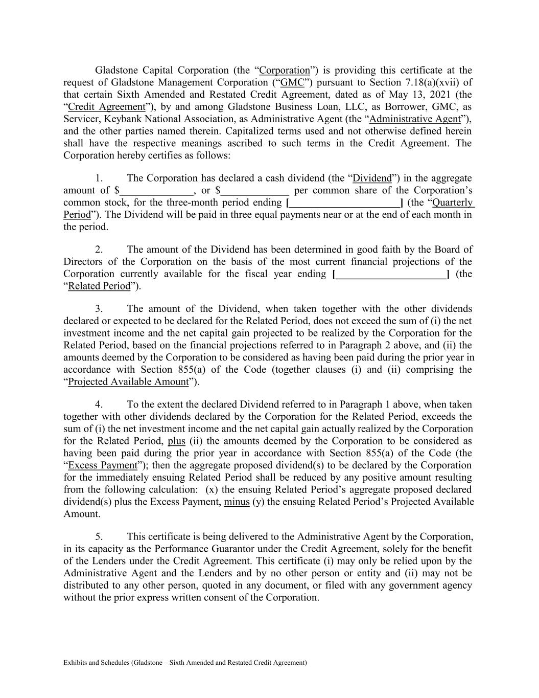 Gladstone Capital Corporation (the “Corporation”) is providing this certificate at the request of Gladstone Management Corporation (“GMC”) pursuant to Section 7.18(a)(xvii) of that certain Sixth Amended and Restated Credit Agreement, dated as of May 13, 2021 (the “Credit Agreement”), by and among Gladstone Business Loan, LLC, as Borrower, GMC, as Servicer, Keybank National Association, as Administrative Agent (the “Administrative Agent”), and the other parties named therein. Capitalized terms used and not otherwise defined herein shall have the respective meanings ascribed to such terms in the Credit Agreement. The Corporation hereby certifies as follows: 1. The Corporation has declared a cash dividend (the “Dividend”) in the aggregate amount of $______________, or $_____________ per common share of the Corporation’s common stock, for the three-month period ending [_____________________] (the “Quarterly Period”). The Dividend will be paid in three equal payments near or at the end of each month in the period. 2. The amount of the Dividend has been determined in good faith by the Board of Directors of the Corporation on the basis of the most current financial projections of the Corporation currently available for the fiscal year ending [_____________________] (the “Related Period”). 3. The amount of the Dividend, when taken together with the other dividends declared or expected to be declared for the Related Period, does not exceed the sum of (i) the net investment income and the net capital gain projected to be realized by the Corporation for the Related Period, based on the financial projections referred to in Paragraph 2 above, and (ii) the amounts deemed by the Corporation to be considered as having been paid during the prior year in accordance with Section 855(a) of the Code (together clauses (i) and (ii) comprising the “Projected Available Amount”). 4. To the extent the declared Dividend referred to in Paragraph 1 above, when taken together with other dividends declared by the Corporation for the Related Period, exceeds the sum of (i) the net investment income and the net capital gain actually realized by the Corporation for the Related Period, plus (ii) the amounts deemed by the Corporation to be considered as having been paid during the prior year in accordance with Section 855(a) of the Code (the “Excess Payment”); then the aggregate proposed dividend(s) to be declared by the Corporation for the immediately ensuing Related Period shall be reduced by any positive amount resulting from the following calculation: (x) the ensuing Related Period’s aggregate proposed declared dividend(s) plus the Excess Payment, minus (y) the ensuing Related Period’s Projected Available Amount. 5. This certificate is being delivered to the Administrative Agent by the Corporation, in its capacity as the Performance Guarantor under the Credit Agreement, solely for the benefit of the Lenders under the Credit Agreement. This certificate (i) may only be relied upon by the Administrative Agent and the Lenders and by no other person or entity and (ii) may not be distributed to any other person, quoted in any document, or filed with any government agency without the prior express written consent of the Corporation.  Exhibits and Schedules (Gladstone – Sixth Amended and Restated Credit Agreement)