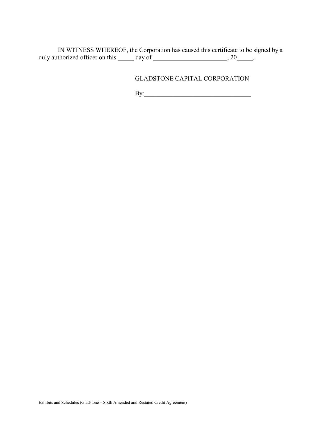 IN WITNESS WHEREOF, the Corporation has caused this certificate to be signed by a duly authorized officer on this _____ day of _______________________, 20_____. GLADSTONE CAPITAL CORPORATION By: Exhibits and Schedules (Gladstone – Sixth Amended and Restated Credit Agreement)