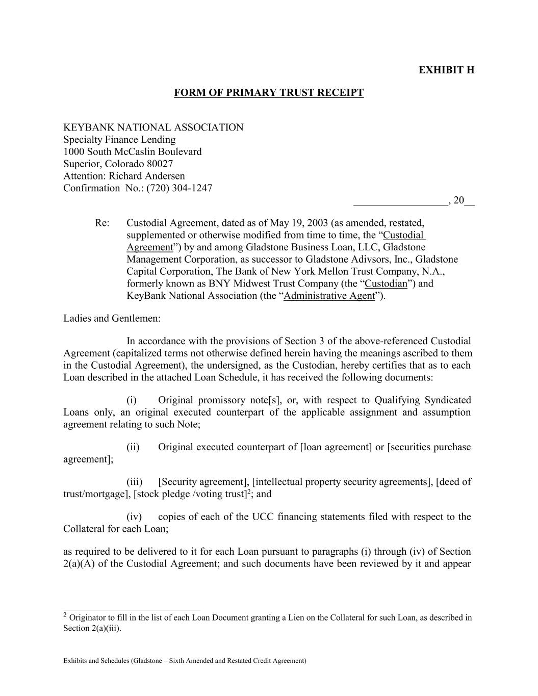 Exhibits and Schedules (Gladstone – Sixth Amended and Restated Credit Agreement) EXHIBIT H FORM OF PRIMARY TRUST RECEIPT KEYBANK NATIONAL ASSOCIATION Specialty Finance Lending 1000 South McCaslin Boulevard Superior, Colorado 80027 Attention: Richard Andersen Confirmation No.: (720) 304-1247 __________________, 20__ Re: Custodial Agreement, dated as of May 19, 2003 (as amended, restated, supplemented or otherwise modified from time to time, the “Custodial Agreement”) by and among Gladstone Business Loan, LLC, Gladstone Management Corporation, as successor to Gladstone Adivsors, Inc., Gladstone Capital Corporation, The Bank of New York Mellon Trust Company, N.A., formerly known as BNY Midwest Trust Company (the “Custodian”) and KeyBank National Association (the “Administrative Agent”). Ladies and Gentlemen: In accordance with the provisions of Section 3 of the above-referenced Custodial Agreement (capitalized terms not otherwise defined herein having the meanings ascribed to them in the Custodial Agreement), the undersigned, as the Custodian, hereby certifies that as to each Loan described in the attached Loan Schedule, it has received the following documents: (i) Original promissory note[s], or, with respect to Qualifying Syndicated Loans only, an original executed counterpart of the applicable assignment and assumption agreement relating to such Note; (ii) Original executed counterpart of [loan agreement] or [securities purchase agreement]; (iii) [Security agreement], [intellectual property security agreements], [deed of trust/mortgage], [stock pledge /voting trust]2; and (iv) copies of each of the UCC financing statements filed with respect to the Collateral for each Loan; as required to be delivered to it for each Loan pursuant to paragraphs (i) through (iv) of Section 2(a)(A) of the Custodial Agreement; and such documents have been reviewed by it and appear 2 Originator to fill in the list of each Loan Document granting a Lien on the Collateral for such Loan, as described in Section 2(a)(iii).