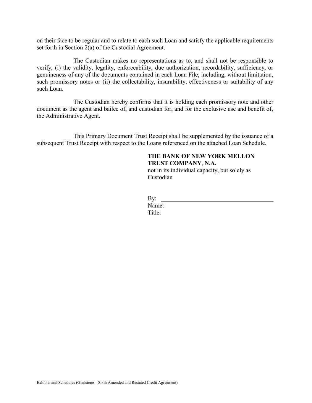 Exhibits and Schedules (Gladstone – Sixth Amended and Restated Credit Agreement) THE BANK OF NEW YORK MELLON TRUST COMPANY, N.A. not in its individual capacity, but solely as Custodian By: on their face to be regular and to relate to each such Loan and satisfy the applicable requirements set forth in Section 2(a) of the Custodial Agreement. The Custodian makes no representations as to, and shall not be responsible to verify, (i) the validity, legality, enforceability, due authorization, recordability, sufficiency, or genuineness of any of the documents contained in each Loan File, including, without limitation, such promissory notes or (ii) the collectability, insurability, effectiveness or suitability of any such Loan. The Custodian hereby confirms that it is holding each promissory note and other document as the agent and bailee of, and custodian for, and for the exclusive use and benefit of, the Administrative Agent. This Primary Document Trust Receipt shall be supplemented by the issuance of a subsequent Trust Receipt with respect to the Loans referenced on the attached Loan Schedule. Name: Title: