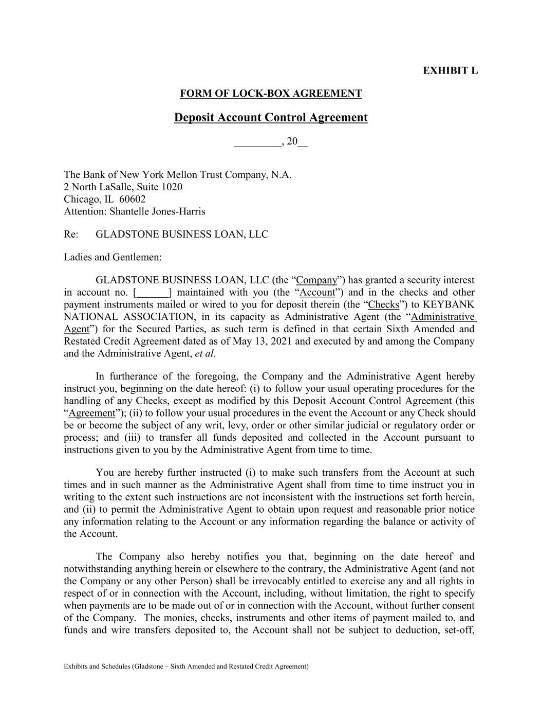 EXHIBIT L FORM OF LOCK-BOX AGREEMENT Deposit Account Control Agreement _________, 20__ The Bank of New York Mellon Trust Company, N.A. 2 North LaSalle, Suite 1020 Chicago, IL 60602 Attention: Shantelle Jones-Harris Re: GLADSTONE BUSINESS LOAN, LLC Ladies and Gentlemen: GLADSTONE BUSINESS LOAN, LLC (the “Company”) has granted a security interest in account no. [______] maintained with you (the “Account”) and in the checks and other payment instruments mailed or wired to you for deposit therein (the “Checks”) to KEYBANK NATIONAL ASSOCIATION, in its capacity as Administrative Agent (the “Administrative Agent”) for the Secured Parties, as such term is defined in that certain Sixth Amended and Restated Credit Agreement dated as of May 13, 2021 and executed by and among the Company and the Administrative Agent, et al. In furtherance of the foregoing, the Company and the Administrative Agent hereby instruct you, beginning on the date hereof: (i) to follow your usual operating procedures for the handling of any Checks, except as modified by this Deposit Account Control Agreement (this “Agreement”); (ii) to follow your usual procedures in the event the Account or any Check should be or become the subject of any writ, levy, order or other similar judicial or regulatory order or process; and (iii) to transfer all funds deposited and collected in the Account pursuant to instructions given to you by the Administrative Agent from time to time. You are hereby further instructed (i) to make such transfers from the Account at such times and in such manner as the Administrative Agent shall from time to time instruct you in writing to the extent such instructions are not inconsistent with the instructions set forth herein, and (ii) to permit the Administrative Agent to obtain upon request and reasonable prior notice any information relating to the Account or any information regarding the balance or activity of the Account. The Company also hereby notifies you that, beginning on the date hereof and notwithstanding anything herein or elsewhere to the contrary, the Administrative Agent (and not the Company or any other Person) shall be irrevocably entitled to exercise any and all rights in respect of or in connection with the Account, including, without limitation, the right to specify when payments are to be made out of or in connection with the Account, without further consent of the Company. The monies, checks, instruments and other items of payment mailed to, and funds and wire transfers deposited to, the Account shall not be subject to deduction, set-off, Exhibits and Schedules (Gladstone – Sixth Amended and Restated Credit Agreement)