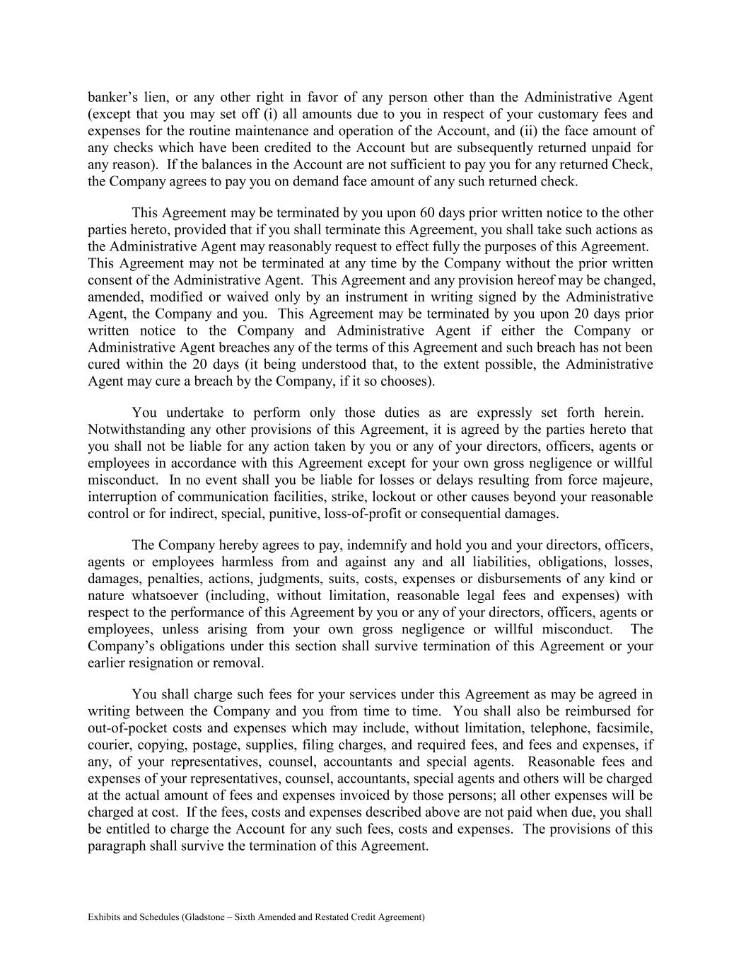 banker’s lien, or any other right in favor of any person other than the Administrative Agent (except that you may set off (i) all amounts due to you in respect of your customary fees and expenses for the routine maintenance and operation of the Account, and (ii) the face amount of any checks which have been credited to the Account but are subsequently returned unpaid for any reason). If the balances in the Account are not sufficient to pay you for any returned Check, the Company agrees to pay you on demand face amount of any such returned check. This Agreement may be terminated by you upon 60 days prior written notice to the other parties hereto, provided that if you shall terminate this Agreement, you shall take such actions as the Administrative Agent may reasonably request to effect fully the purposes of this Agreement. This Agreement may not be terminated at any time by the Company without the prior written consent of the Administrative Agent. This Agreement and any provision hereof may be changed, amended, modified or waived only by an instrument in writing signed by the Administrative Agent, the Company and you. This Agreement may be terminated by you upon 20 days prior written notice to the Company and Administrative Agent if either the Company or Administrative Agent breaches any of the terms of this Agreement and such breach has not been cured within the 20 days (it being understood that, to the extent possible, the Administrative Agent may cure a breach by the Company, if it so chooses). You undertake to perform only those duties as are expressly set forth herein. Notwithstanding any other provisions of this Agreement, it is agreed by the parties hereto that you shall not be liable for any action taken by you or any of your directors, officers, agents or employees in accordance with this Agreement except for your own gross negligence or willful misconduct. In no event shall you be liable for losses or delays resulting from force majeure, interruption of communication facilities, strike, lockout or other causes beyond your reasonable control or for indirect, special, punitive, loss-of-profit or consequential damages. The Company hereby agrees to pay, indemnify and hold you and your directors, officers, agents or employees harmless from and against any and all liabilities, obligations, losses, damages, penalties, actions, judgments, suits, costs, expenses or disbursements of any kind or nature whatsoever (including, without limitation, reasonable legal fees and expenses) with respect to the performance of this Agreement by you or any of your directors, officers, agents or employees, unless arising from your own gross negligence or willful misconduct. The Company’s obligations under this section shall survive termination of this Agreement or your earlier resignation or removal. You shall charge such fees for your services under this Agreement as may be agreed in writing between the Company and you from time to time. You shall also be reimbursed for out-of-pocket costs and expenses which may include, without limitation, telephone, facsimile, courier, copying, postage, supplies, filing charges, and required fees, and fees and expenses, if any, of your representatives, counsel, accountants and special agents. Reasonable fees and expenses of your representatives, counsel, accountants, special agents and others will be charged at the actual amount of fees and expenses invoiced by those persons; all other expenses will be charged at cost. If the fees, costs and expenses described above are not paid when due, you shall be entitled to charge the Account for any such fees, costs and expenses. The provisions of this paragraph shall survive the termination of this Agreement. Exhibits and Schedules (Gladstone – Sixth Amended and Restated Credit Agreement)