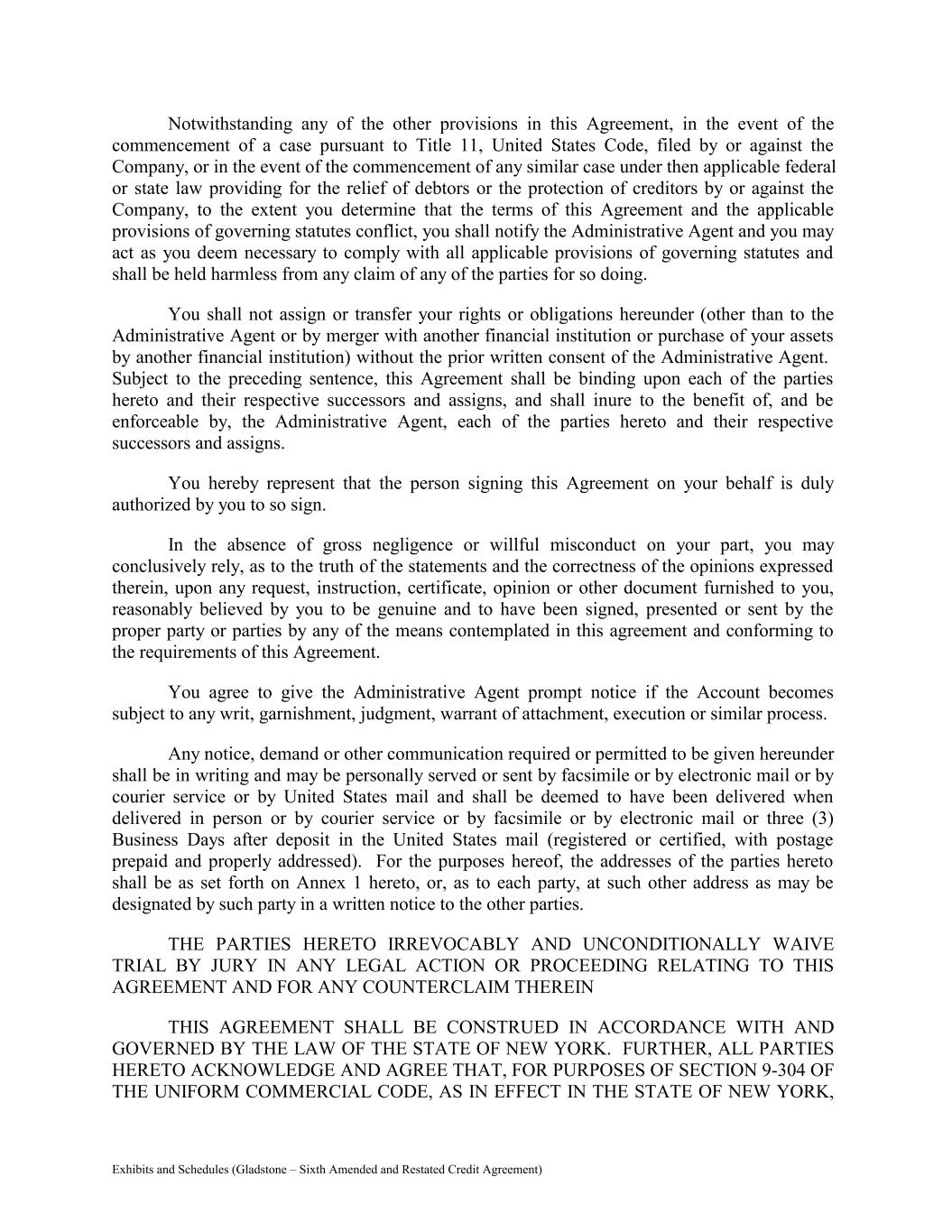 Notwithstanding any of the other provisions in this Agreement, in the event of the commencement of a case pursuant to Title 11, United States Code, filed by or against the Company, or in the event of the commencement of any similar case under then applicable federal or state law providing for the relief of debtors or the protection of creditors by or against the Company, to the extent you determine that the terms of this Agreement and the applicable provisions of governing statutes conflict, you shall notify the Administrative Agent and you may act as you deem necessary to comply with all applicable provisions of governing statutes and shall be held harmless from any claim of any of the parties for so doing. You shall not assign or transfer your rights or obligations hereunder (other than to the Administrative Agent or by merger with another financial institution or purchase of your assets by another financial institution) without the prior written consent of the Administrative Agent. Subject to the preceding sentence, this Agreement shall be binding upon each of the parties hereto and their respective successors and assigns, and shall inure to the benefit of, and be enforceable by, the Administrative Agent, each of the parties hereto and their respective successors and assigns. You hereby represent that the person signing this Agreement on your behalf is duly authorized by you to so sign. In the absence of gross negligence or willful misconduct on your part, you may conclusively rely, as to the truth of the statements and the correctness of the opinions expressed therein, upon any request, instruction, certificate, opinion or other document furnished to you, reasonably believed by you to be genuine and to have been signed, presented or sent by the proper party or parties by any of the means contemplated in this agreement and conforming to the requirements of this Agreement. You agree to give the Administrative Agent prompt notice if the Account becomes subject to any writ, garnishment, judgment, warrant of attachment, execution or similar process. Any notice, demand or other communication required or permitted to be given hereunder shall be in writing and may be personally served or sent by facsimile or by electronic mail or by courier service or by United States mail and shall be deemed to have been delivered when delivered in person or by courier service or by facsimile or by electronic mail or three (3) Business Days after deposit in the United States mail (registered or certified, with postage prepaid and properly addressed). For the purposes hereof, the addresses of the parties hereto shall be as set forth on Annex 1 hereto, or, as to each party, at such other address as may be designated by such party in a written notice to the other parties. THE PARTIES HERETO IRREVOCABLY AND UNCONDITIONALLY WAIVE TRIAL BY JURY IN ANY LEGAL ACTION OR PROCEEDING RELATING TO THIS AGREEMENT AND FOR ANY COUNTERCLAIM THEREIN THIS AGREEMENT SHALL BE CONSTRUED IN ACCORDANCE WITH AND GOVERNED BY THE LAW OF THE STATE OF NEW YORK. FURTHER, ALL PARTIES HERETO ACKNOWLEDGE AND AGREE THAT, FOR PURPOSES OF SECTION 9-304 OF THE UNIFORM COMMERCIAL CODE, AS IN EFFECT IN THE STATE OF NEW YORK, Exhibits and Schedules (Gladstone – Sixth Amended and Restated Credit Agreement)