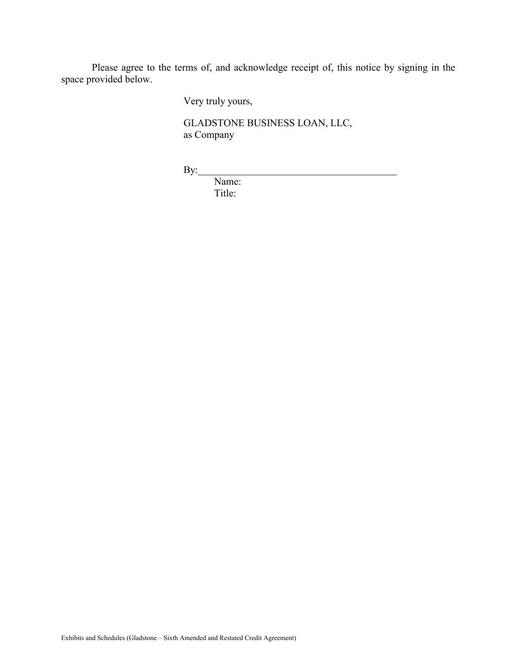 Please agree to the terms of, and acknowledge receipt of, this notice by signing in the space provided below. Very truly yours, GLADSTONE BUSINESS LOAN, LLC, as Company By:_______________________________________ Name: Title: Exhibits and Schedules (Gladstone – Sixth Amended and Restated Credit Agreement)
