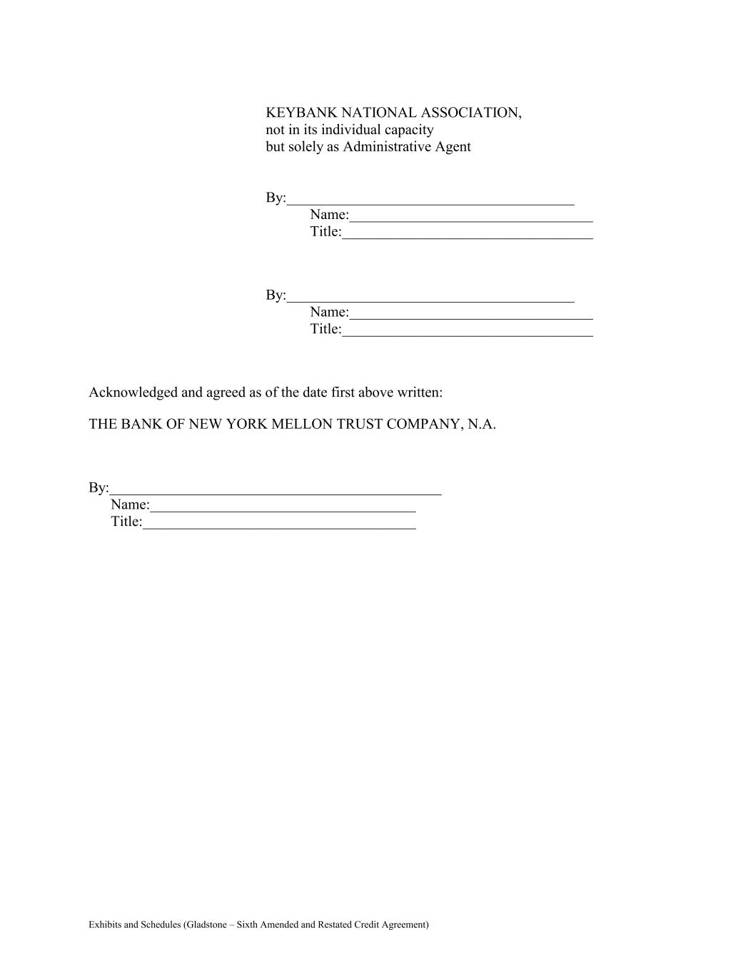 KEYBANK NATIONAL ASSOCIATION, not in its individual capacity but solely as Administrative Agent By:_______________________________________ Name:_________________________________ Title:__________________________________ By:_______________________________________ Name:_________________________________ Title:__________________________________ Acknowledged and agreed as of the date first above written: THE BANK OF NEW YORK MELLON TRUST COMPANY, N.A. By:_____________________________________________ Name:____________________________________ Title:_____________________________________ Exhibits and Schedules (Gladstone – Sixth Amended and Restated Credit Agreement)
