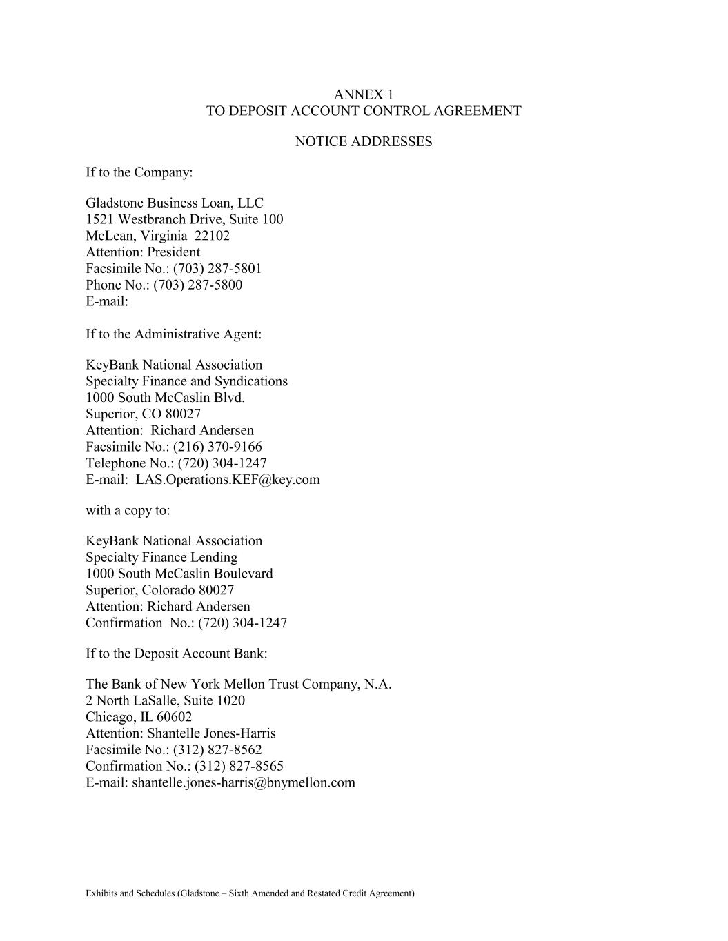 ANNEX 1 TO DEPOSIT ACCOUNT CONTROL AGREEMENT NOTICE ADDRESSES If to the Company: Gladstone Business Loan, LLC 1521 Westbranch Drive, Suite 100 McLean, Virginia 22102 Attention: President Facsimile No.: (703) 287-5801 Phone No.: (703) 287-5800 E-mail: If to the Administrative Agent: KeyBank National Association Specialty Finance and Syndications 1000 South McCaslin Blvd. Superior, CO 80027 Attention: Richard Andersen Facsimile No.: (216) 370-9166 Telephone No.: (720) 304-1247 E-mail: LAS.Operations.KEF@key.com with a copy to: KeyBank National Association Specialty Finance Lending 1000 South McCaslin Boulevard Superior, Colorado 80027 Attention: Richard Andersen Confirmation No.: (720) 304-1247 If to the Deposit Account Bank: The Bank of New York Mellon Trust Company, N.A. 2 North LaSalle, Suite 1020 Chicago, IL 60602 Attention: Shantelle Jones-Harris Facsimile No.: (312) 827-8562 Confirmation No.: (312) 827-8565 E-mail: shantelle.jones-harris@bnymellon.com Exhibits and Schedules (Gladstone – Sixth Amended and Restated Credit Agreement)