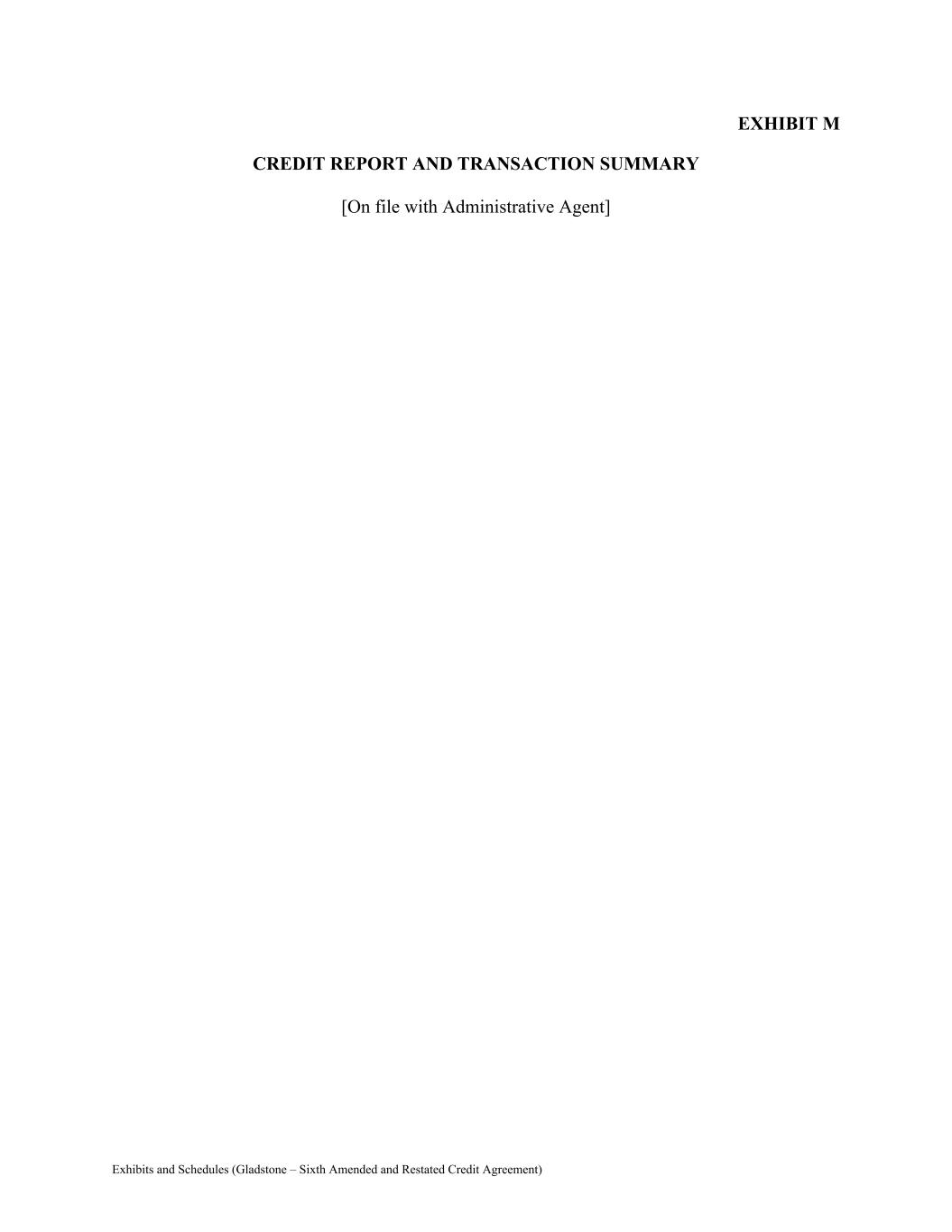 EXHIBIT M CREDIT REPORT AND TRANSACTION SUMMARY [On file with Administrative Agent] Exhibits and Schedules (Gladstone – Sixth Amended and Restated Credit Agreement)