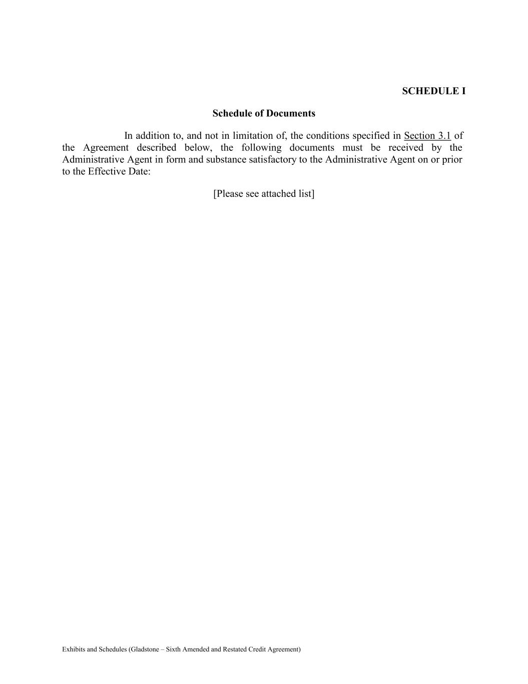 SCHEDULE I Schedule of Documents In addition to, and not in limitation of, the conditions specified in Section 3.1 of the Agreement described below, the following documents must be received by the Administrative Agent in form and substance satisfactory to the Administrative Agent on or prior to the Effective Date: [Please see attached list] Exhibits and Schedules (Gladstone – Sixth Amended and Restated Credit Agreement)