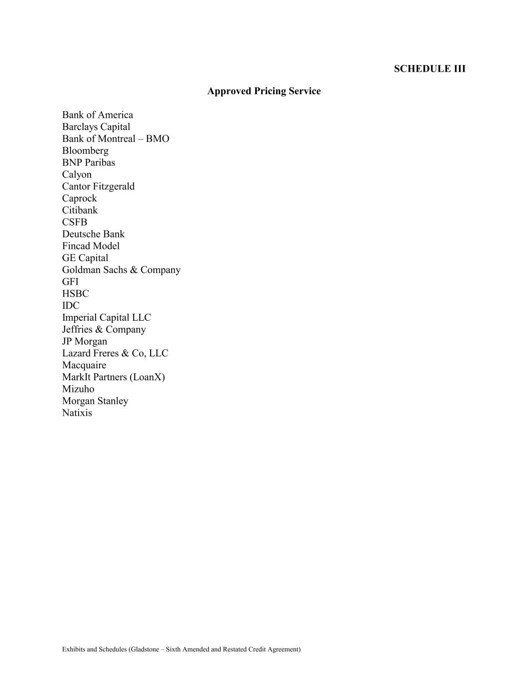 SCHEDULE III Approved Pricing Service Bank of America Barclays Capital Bank of Montreal – BMO Bloomberg BNP Paribas Calyon Cantor Fitzgerald Caprock Citibank CSFB Deutsche Bank Fincad Model GE Capital Goldman Sachs & Company GFI HSBC IDC Imperial Capital LLC Jeffries & Company JP Morgan Lazard Freres & Co, LLC Macquaire MarkIt Partners (LoanX) Mizuho Morgan Stanley Natixis Exhibits and Schedules (Gladstone – Sixth Amended and Restated Credit Agreement)