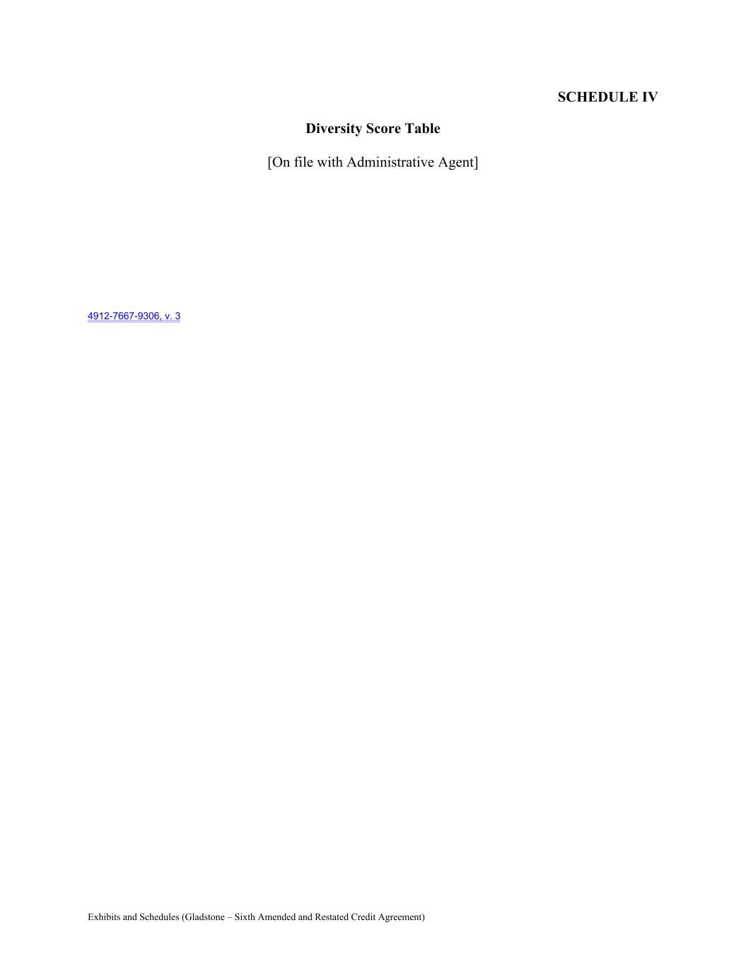 SCHEDULE IV Diversity Score Table [On file with Administrative Agent] 4912-7667-9306, v. 3 Exhibits and Schedules (Gladstone – Sixth Amended and Restated Credit Agreement)