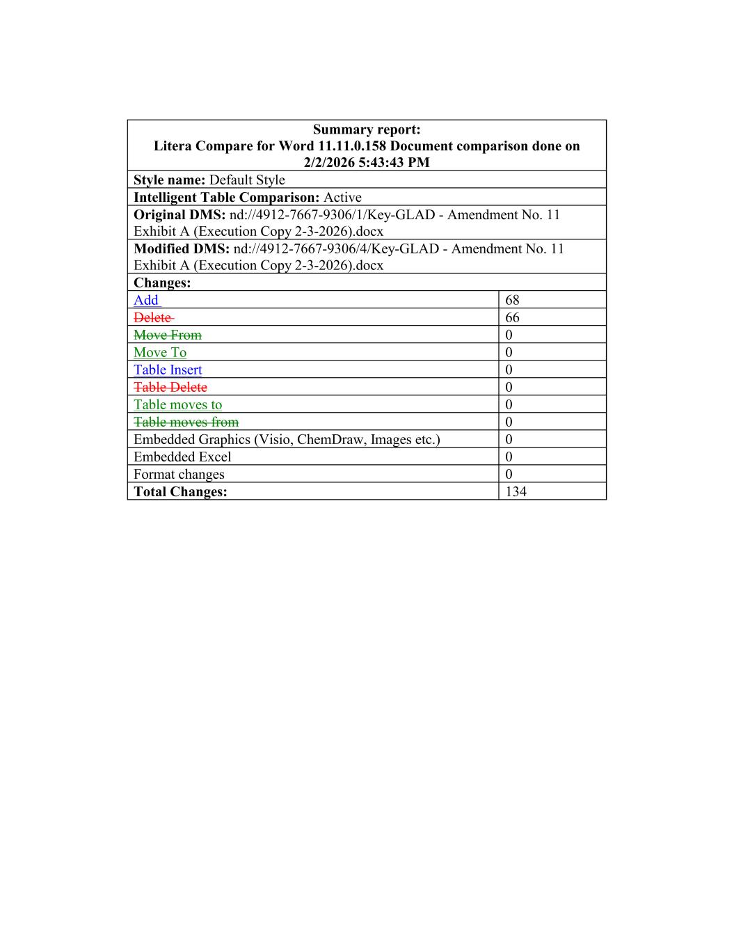 0 Table Insert Changes: 0 Table Delete 0 Add Intelligent Table Comparison: Active Table moves to 68 0 Summary report: Litera Compare for Word 11.11.0.158 Document comparison done on 2/2/2026 5:43:43 PM Table moves from 0 Delete Embedded Graphics (Visio, ChemDraw, Images etc.) 66 0 Original DMS: nd://4912-7667-9306/1/Key-GLAD - Amendment No. 11 Exhibit A (Execution Copy 2-3-2026).docx Embedded Excel 0 Move From Format changes 0 0 Total Changes: Modified DMS: nd://4912-7667-9306/4/Key-GLAD - Amendment No. 11 Exhibit A (Execution Copy 2-3-2026).docx 134 Move To Style name: Default Style