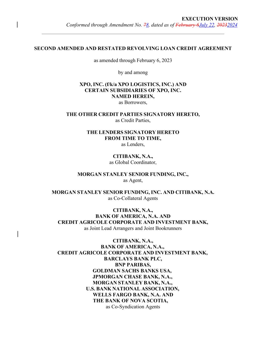 EXECUTION VERSION Conformed through Amendment No. 78, dated as of February 6July 22, 20232024 SECOND AMENDED AND RESTATED REVOLVING LOAN CREDIT AGREEMENT as amended through February 6, 2023 by and among XPO, INC. (f/k/a XPO LOGISTICS, INC.) AND CERTAIN SUBSIDIARIES OF XPO, INC. NAMED HEREIN, as Borrowers, THE OTHER CREDIT PARTIES SIGNATORY HERETO, as Credit Parties, THE LENDERS SIGNATORY HERETO FROM TIME TO TIME, as Lenders, CITIBANK, N.A., as Global Coordinator, MORGAN STANLEY SENIOR FUNDING, INC., as Agent, MORGAN STANLEY SENIOR FUNDING, INC. AND CITIBANK, N.A. as Co-Collateral Agents CITIBANK, N.A., BANK OF AMERICA, N.A. AND CREDIT AGRICOLE CORPORATE AND INVESTMENT BANK, as Joint Lead Arrangers and Joint Bookrunners CITIBANK, N.A., BANK OF AMERICA, N.A., CREDIT AGRICOLE CORPORATE AND INVESTMENT BANK, BARCLAYS BANK PLC, BNP PARIBAS, GOLDMAN SACHS BANKS USA, JPMORGAN CHASE BANK, N.A., MORGAN STANLEY BANK, N.A., U.S. BANK NATIONAL ASSOCIATION, WELLS FARGO BANK, N.A. AND THE BANK OF NOVA SCOTIA, as Co-Syndication Agents