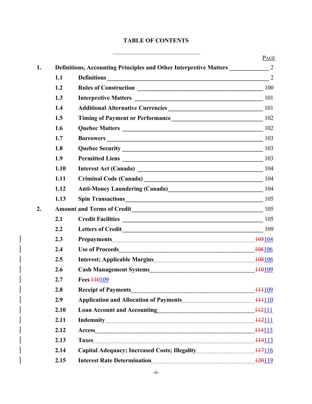 TABLE OF CONTENTS PAGE 1. Definitions, Accounting Principles and Other Interpretive Matters _____________ 2 1.1 Definitions _____________________________________________________ 2 1.2 Rules of Construction _________________________________________ 100 1.3 Interpretive Matters __________________________________________ 101 1.4 Additional Alternative Currencies _______________________________ 101 1.5 Timing of Payment or Performance ______________________________ 102 1.6 Quebec Matters ______________________________________________ 102 1.7 Borrowers ___________________________________________________ 103 1.8 Quebec Security ______________________________________________ 103 1.9 Permitted Liens ______________________________________________ 103 1.10 Interest Act (Canada) _________________________________________ 104 1.11 Criminal Code (Canada) _______________________________________ 104 1.12 Anti-Money Laundering (Canada) _______________________________ 104 1.13 Spin Transactions _____________________________________________ 105 2. Amount and Terms of Credit ___________________________________________ 105 2.1 Credit Facilities ______________________________________________ 105 2.2 Letters of Credit ______________________________________________ 109 2.3 Prepayments 105104 2.4 Use of Proceeds 108106 2.5 Interest; Applicable Margins 108106 2.6 Cash Management Systems 110109 2.7 Fees 110109 2.8 Receipt of Payments 111109 2.9 Application and Allocation of Payments 111110 2.10 Loan Account and Accounting 112111 2.11 Indemnity 112111 2.12 Access 114113 2.13 Taxes 114113 2.14 Capital Adequacy; Increased Costs; Illegality 117116 2.15 Interest Rate Determination 120119 -i-