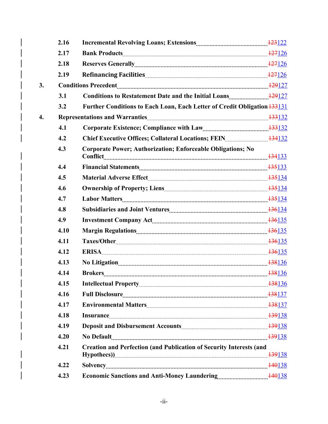 -ii- 2.16 Incremental Revolving Loans; Extensions 123122 2.17 Bank Products 127126 2.18 Reserves Generally 127126 2.19 Refinancing Facilities 127126 3. Conditions Precedent 129127 3.1 Conditions to Restatement Date and the Initial Loans 129127 3.2 Further Conditions to Each Loan, Each Letter of Credit Obligation 133131 4. Representations and Warranties 133132 4.1 Corporate Existence; Compliance with Law 133132 4.2 Chief Executive Offices; Collateral Locations; FEIN 134132 4.3 Corporate Power; Authorization; Enforceable Obligations; No Conflict 134133 4.4 Financial Statements 135133 4.5 Material Adverse Effect 135134 4.6 Ownership of Property; Liens 135134 4.7 Labor Matters 135134 4.8 Subsidiaries and Joint Ventures 136134 4.9 Investment Company Act 136135 4.10 Margin Regulations 136135 4.11 Taxes/Other 136135 4.12 ERISA 136135 4.13 No Litigation 138136 4.14 Brokers 138136 4.15 Intellectual Property 138136 4.16 Full Disclosure 138137 4.17 Environmental Matters 138137 4.18 Insurance 139138 4.19 Deposit and Disbursement Accounts 139138 4.20 No Default 139138 4.21 Creation and Perfection (and Publication of Security Interests (and Hypothecs)) 139138 4.22 Solvency 140138 4.23 Economic Sanctions and Anti-Money Laundering 140138