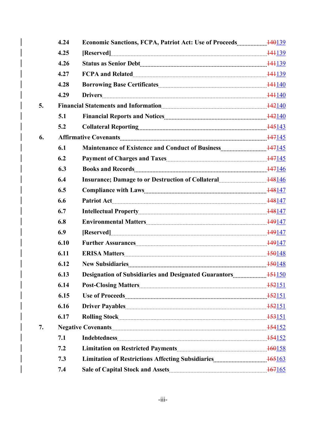 -iii- 4.24 Economic Sanctions, FCPA, Patriot Act: Use of Proceeds 140139 4.25 [Reserved] 141139 4.26 Status as Senior Debt 141139 4.27 FCPA and Related 141139 4.28 Borrowing Base Certificates 141140 4.29 Drivers 141140 5. Financial Statements and Information 142140 5.1 Financial Reports and Notices 142140 5.2 Collateral Reporting 145143 6. Affirmative Covenants 147145 6.1 Maintenance of Existence and Conduct of Business 147145 6.2 Payment of Charges and Taxes 147145 6.3 Books and Records 147146 6.4 Insurance; Damage to or Destruction of Collateral 148146 6.5 Compliance with Laws 148147 6.6 Patriot Act 148147 6.7 Intellectual Property 148147 6.8 Environmental Matters 149147 6.9 [Reserved] 149147 6.10 Further Assurances 149147 6.11 ERISA Matters 150148 6.12 New Subsidiaries 150148 6.13 Designation of Subsidiaries and Designated Guarantors 151150 6.14 Post-Closing Matters 152151 6.15 Use of Proceeds 152151 6.16 Driver Payables 152151 6.17 Rolling Stock 153151 7. Negative Covenants 154152 7.1 Indebtedness 154152 7.2 Limitation on Restricted Payments 160158 7.3 Limitation of Restrictions Affecting Subsidiaries 165163 7.4 Sale of Capital Stock and Assets 167165