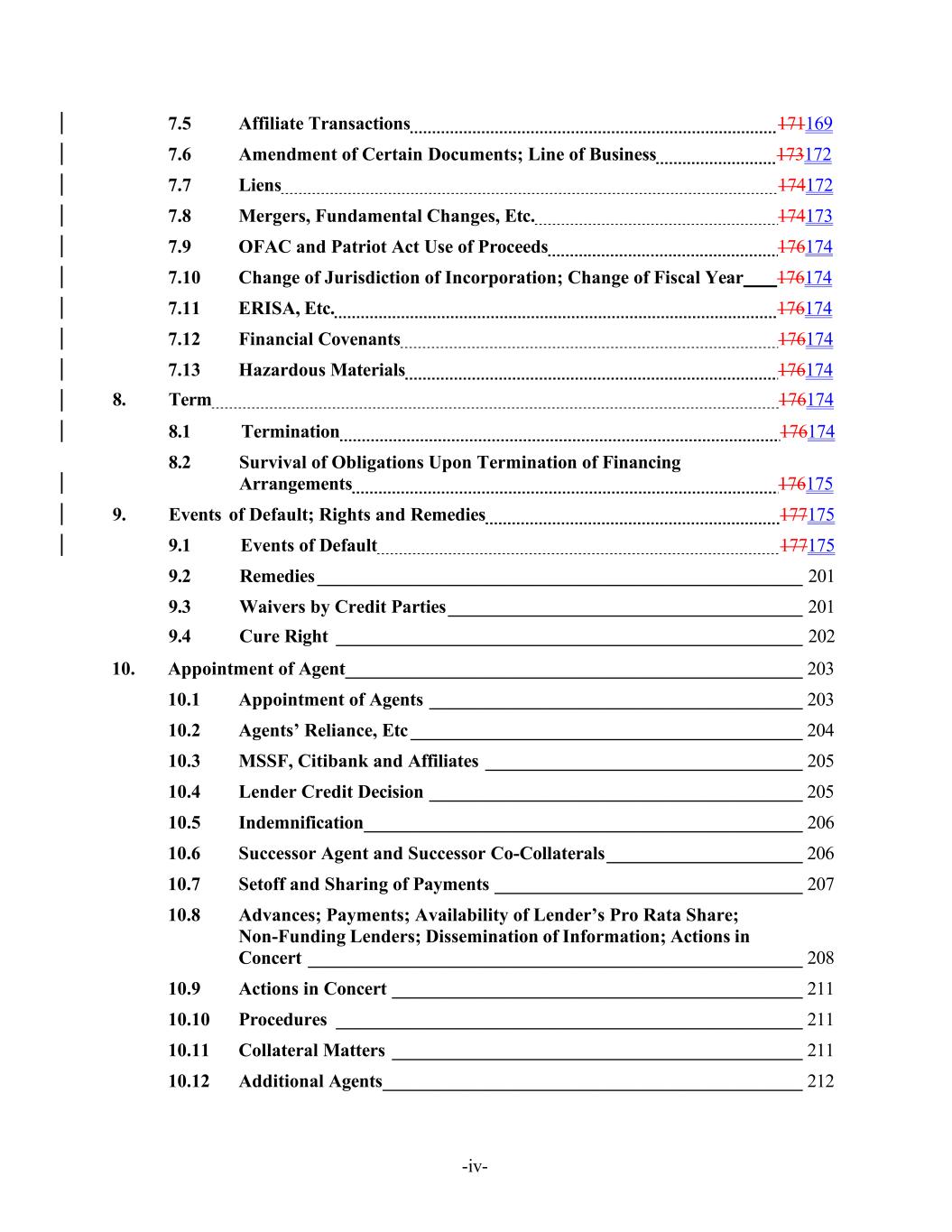 -iv- 7.5 Affiliate Transactions 171169 7.6 Amendment of Certain Documents; Line of Business 173172 7.7 Liens 174172 7.8 Mergers, Fundamental Changes, Etc. 174173 7.9 OFAC and Patriot Act Use of Proceeds 176174 7.10 Change of Jurisdiction of Incorporation; Change of Fiscal Year 176174 7.11 ERISA, Etc. 176174 7.12 Financial Covenants 176174 7.13 Hazardous Materials 176174 8. Term 176174 8.1 Termination 176174 8.2 Survival of Obligations Upon Termination of Financing Arrangements 176175 9. Events of Default; Rights and Remedies 177175 9.1 Events of Default 177175 9.2 Remedies ____________________________________________________ 201 9.3 Waivers by Credit Parties ______________________________________ 201 9.4 Cure Right __________________________________________________ 202 10. Appointment of Agent_________________________________________________ 203 10.1 Appointment of Agents ________________________________________ 203 10.2 Agents’ Reliance, Etc __________________________________________ 204 10.3 MSSF, Citibank and Affiliates __________________________________ 205 10.4 Lender Credit Decision ________________________________________ 205 10.5 Indemnification _______________________________________________ 206 10.6 Successor Agent and Successor Co-Collaterals _____________________ 206 10.7 Setoff and Sharing of Payments _________________________________ 207 10.8 Advances; Payments; Availability of Lender’s Pro Rata Share; Non-Funding Lenders; Dissemination of Information; Actions in Concert _____________________________________________________ 208 10.9 Actions in Concert ____________________________________________ 211 10.10 Procedures __________________________________________________ 211 10.11 Collateral Matters ____________________________________________ 211 10.12 Additional Agents _____________________________________________ 212