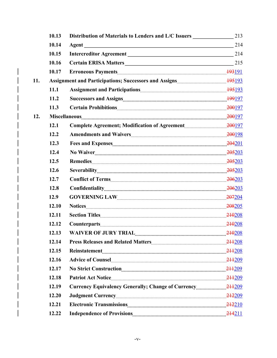 -v- 10.13 Distribution of Materials to Lenders and L/C Issuers _______________ 213 10.14 Agent _______________________________________________________ 214 10.15 Intercreditor Agreement _______________________________________ 214 10.16 Certain ERISA Matters ________________________________________ 215 10.17 Erroneous Payments 193191 11. Assignment and Participations; Successors and Assigns 195193 11.1 Assignment and Participations 195193 11.2 Successors and Assigns 199197 11.3 Certain Prohibitions 200197 12. Miscellaneous 200197 12.1 Complete Agreement; Modification of Agreement 200197 12.2 Amendments and Waivers 200198 12.3 Fees and Expenses 204201 12.4 No Waiver 205203 12.5 Remedies 205203 12.6 Severability 205203 12.7 Conflict of Terms 206203 12.8 Confidentiality 206203 12.9 GOVERNING LAW 207204 12.10 Notices 208205 12.11 Section Titles 210208 12.12 Counterparts 210208 12.13 WAIVER OF JURY TRIAL 210208 12.14 Press Releases and Related Matters 211208 12.15 Reinstatement 211208 12.16 Advice of Counsel 211209 12.17 No Strict Construction 211209 12.18 Patriot Act Notice 211209 12.19 Currency Equivalency Generally; Change of Currency 211209 12.20 Judgment Currency 212209 12.21 Electronic Transmissions 212210 12.22 Independence of Provisions 214211