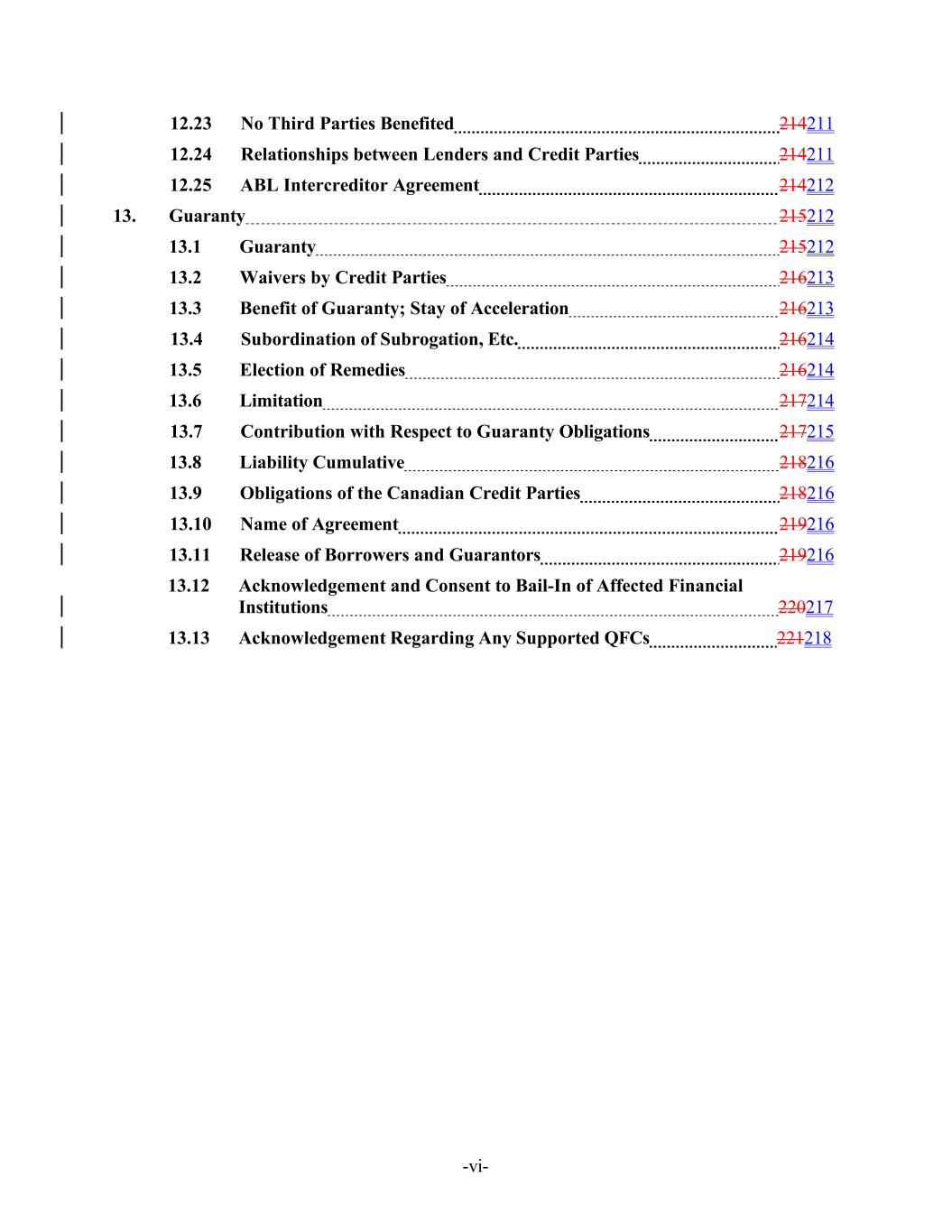 -vi- 12.23 No Third Parties Benefited 214211 12.24 Relationships between Lenders and Credit Parties 214211 12.25 ABL Intercreditor Agreement 214212 13. Guaranty 215212 13.1 Guaranty 215212 13.2 Waivers by Credit Parties 216213 13.3 Benefit of Guaranty; Stay of Acceleration 216213 13.4 Subordination of Subrogation, Etc. 216214 13.5 Election of Remedies 216214 13.6 Limitation 217214 13.7 Contribution with Respect to Guaranty Obligations 217215 13.8 Liability Cumulative 218216 13.9 Obligations of the Canadian Credit Parties 218216 13.10 Name of Agreement 219216 13.11 Release of Borrowers and Guarantors 219216 13.12 Acknowledgement and Consent to Bail-In of Affected Financial Institutions 220217 13.13 Acknowledgement Regarding Any Supported QFCs 221218