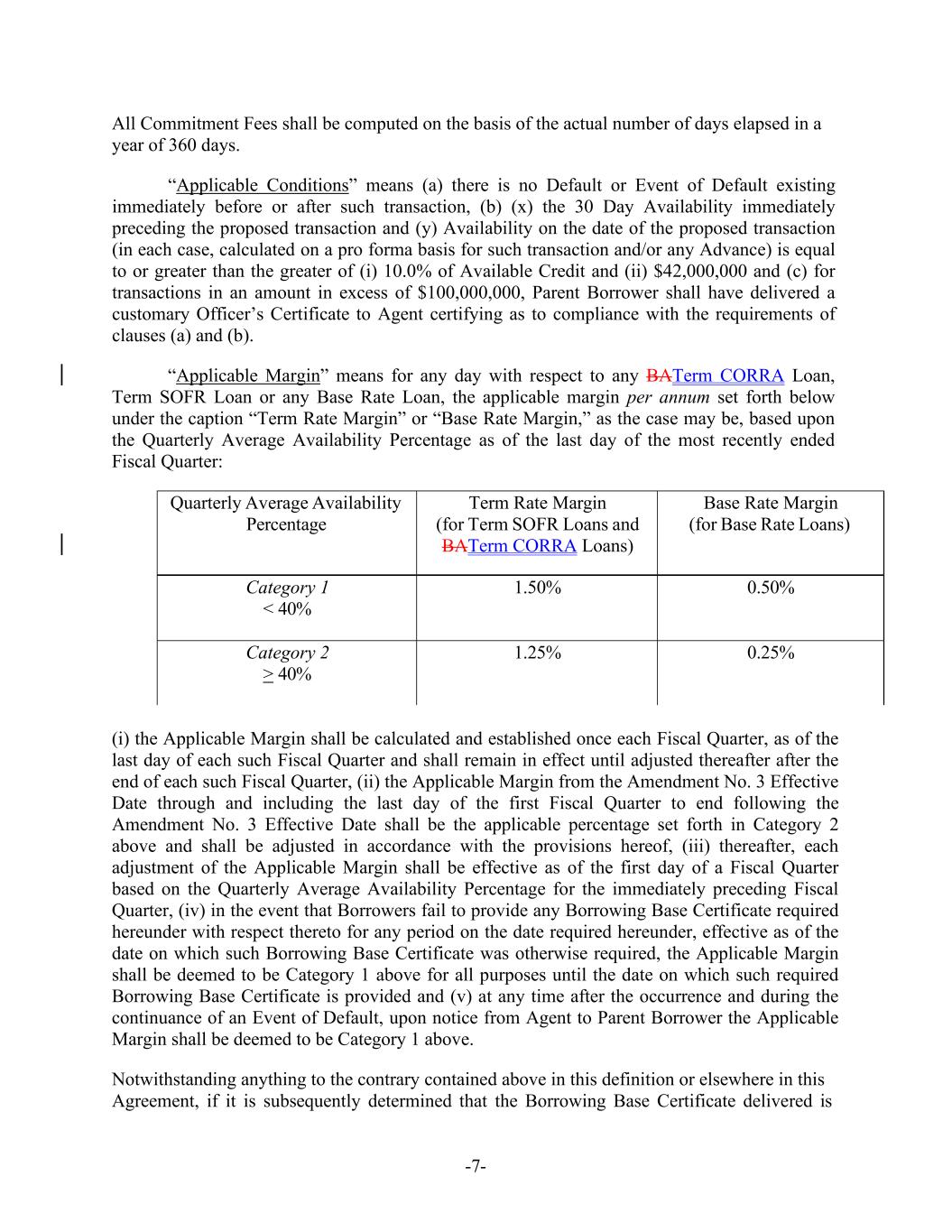 -7- Quarterly Average Availability Percentage Term Rate Margin (for Term SOFR Loans and BATerm CORRA Loans) Base Rate Margin (for Base Rate Loans) Category 1 < 40% 1.50% 0.50% Category 2 > 40% 1.25% 0.25% All Commitment Fees shall be computed on the basis of the actual number of days elapsed in a year of 360 days. “Applicable Conditions” means (a) there is no Default or Event of Default existing immediately before or after such transaction, (b) (x) the 30 Day Availability immediately preceding the proposed transaction and (y) Availability on the date of the proposed transaction (in each case, calculated on a pro forma basis for such transaction and/or any Advance) is equal to or greater than the greater of (i) 10.0% of Available Credit and (ii) $42,000,000 and (c) for transactions in an amount in excess of $100,000,000, Parent Borrower shall have delivered a customary Officer’s Certificate to Agent certifying as to compliance with the requirements of clauses (a) and (b). “Applicable Margin” means for any day with respect to any BATerm CORRA Loan, Term SOFR Loan or any Base Rate Loan, the applicable margin per annum set forth below under the caption “Term Rate Margin” or “Base Rate Margin,” as the case may be, based upon the Quarterly Average Availability Percentage as of the last day of the most recently ended Fiscal Quarter: (i) the Applicable Margin shall be calculated and established once each Fiscal Quarter, as of the last day of each such Fiscal Quarter and shall remain in effect until adjusted thereafter after the end of each such Fiscal Quarter, (ii) the Applicable Margin from the Amendment No. 3 Effective Date through and including the last day of the first Fiscal Quarter to end following the Amendment No. 3 Effective Date shall be the applicable percentage set forth in Category 2 above and shall be adjusted in accordance with the provisions hereof, (iii) thereafter, each adjustment of the Applicable Margin shall be effective as of the first day of a Fiscal Quarter based on the Quarterly Average Availability Percentage for the immediately preceding Fiscal Quarter, (iv) in the event that Borrowers fail to provide any Borrowing Base Certificate required hereunder with respect thereto for any period on the date required hereunder, effective as of the date on which such Borrowing Base Certificate was otherwise required, the Applicable Margin shall be deemed to be Category 1 above for all purposes until the date on which such required Borrowing Base Certificate is provided and (v) at any time after the occurrence and during the continuance of an Event of Default, upon notice from Agent to Parent Borrower the Applicable Margin shall be deemed to be Category 1 above. Notwithstanding anything to the contrary contained above in this definition or elsewhere in this Agreement, if it is subsequently determined that the Borrowing Base Certificate delivered is
