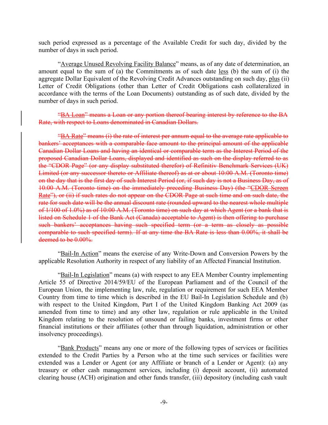 -9- such period expressed as a percentage of the Available Credit for such day, divided by the number of days in such period. “Average Unused Revolving Facility Balance” means, as of any date of determination, an amount equal to the sum of (a) the Commitments as of such date less (b) the sum of (i) the aggregate Dollar Equivalent of the Revolving Credit Advances outstanding on such day, plus (ii) Letter of Credit Obligations (other than Letter of Credit Obligations cash collateralized in accordance with the terms of the Loan Documents) outstanding as of such date, divided by the number of days in such period. “BA Loan” means a Loan or any portion thereof bearing interest by reference to the BA Rate, with respect to Loans denominated in Canadian Dollars. “BA Rate” means (i) the rate of interest per annum equal to the average rate applicable to bankers’ acceptances with a comparable face amount to the principal amount of the applicable Canadian Dollar Loans and having an identical or comparable term as the Interest Period of the proposed Canadian Dollar Loans, displayed and identified as such on the display referred to as the “CDOR Page” (or any display substituted therefor) of Refinitiv Benchmark Services (UK) Limited (or any successor thereto or Affiliate thereof) as at or about 10:00 A.M. (Toronto time) on the day that is the first day of such Interest Period (or, if such day is not a Business Day, as of 10:00 A.M. (Toronto time) on the immediately preceding Business Day) (the “CDOR Screen Rate”), or (ii) if such rates do not appear on the CDOR Page at such time and on such date, the rate for such date will be the annual discount rate (rounded upward to the nearest whole multiple of 1/100 of 1.0%) as of 10:00 A.M. (Toronto time) on such day at which Agent (or a bank that is listed on Schedule 1 of the Bank Act (Canada) acceptable to Agent) is then offering to purchase such bankers’ acceptances having such specified term (or a term as closely as possible comparable to such specified term). If at any time the BA Rate is less than 0.00%, it shall be deemed to be 0.00%. “Bail-In Action” means the exercise of any Write-Down and Conversion Powers by the applicable Resolution Authority in respect of any liability of an Affected Financial Institution. “Bail-In Legislation” means (a) with respect to any EEA Member Country implementing Article 55 of Directive 2014/59/EU of the European Parliament and of the Council of the European Union, the implementing law, rule, regulation or requirement for such EEA Member Country from time to time which is described in the EU Bail-In Legislation Schedule and (b) with respect to the United Kingdom, Part I of the United Kingdom Banking Act 2009 (as amended from time to time) and any other law, regulation or rule applicable in the United Kingdom relating to the resolution of unsound or failing banks, investment firms or other financial institutions or their affiliates (other than through liquidation, administration or other insolvency proceedings). “Bank Products” means any one or more of the following types of services or facilities extended to the Credit Parties by a Person who at the time such services or facilities were extended was a Lender or Agent (or any Affiliate or branch of a Lender or Agent): (a) any treasury or other cash management services, including (i) deposit account, (ii) automated clearing house (ACH) origination and other funds transfer, (iii) depository (including cash vault