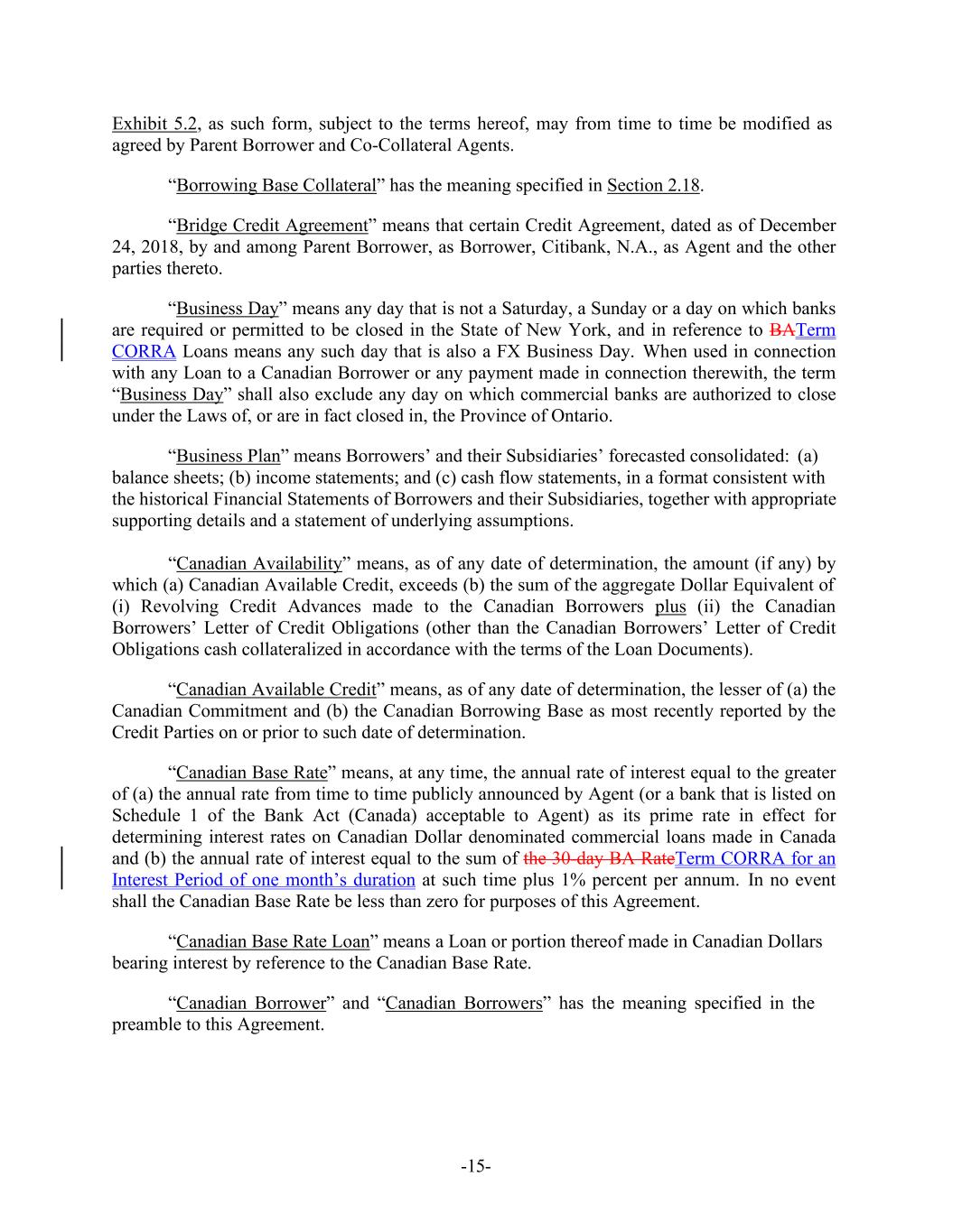 -15- Exhibit 5.2, as such form, subject to the terms hereof, may from time to time be modified as agreed by Parent Borrower and Co-Collateral Agents. “Borrowing Base Collateral” has the meaning specified in Section 2.18. “Bridge Credit Agreement” means that certain Credit Agreement, dated as of December 24, 2018, by and among Parent Borrower, as Borrower, Citibank, N.A., as Agent and the other parties thereto. “Business Day” means any day that is not a Saturday, a Sunday or a day on which banks are required or permitted to be closed in the State of New York, and in reference to BATerm CORRA Loans means any such day that is also a FX Business Day. When used in connection with any Loan to a Canadian Borrower or any payment made in connection therewith, the term “Business Day” shall also exclude any day on which commercial banks are authorized to close under the Laws of, or are in fact closed in, the Province of Ontario. “Business Plan” means Borrowers’ and their Subsidiaries’ forecasted consolidated: (a) balance sheets; (b) income statements; and (c) cash flow statements, in a format consistent with the historical Financial Statements of Borrowers and their Subsidiaries, together with appropriate supporting details and a statement of underlying assumptions. “Canadian Availability” means, as of any date of determination, the amount (if any) by which (a) Canadian Available Credit, exceeds (b) the sum of the aggregate Dollar Equivalent of (i) Revolving Credit Advances made to the Canadian Borrowers plus (ii) the Canadian Borrowers’ Letter of Credit Obligations (other than the Canadian Borrowers’ Letter of Credit Obligations cash collateralized in accordance with the terms of the Loan Documents). “Canadian Available Credit” means, as of any date of determination, the lesser of (a) the Canadian Commitment and (b) the Canadian Borrowing Base as most recently reported by the Credit Parties on or prior to such date of determination. “Canadian Base Rate” means, at any time, the annual rate of interest equal to the greater of (a) the annual rate from time to time publicly announced by Agent (or a bank that is listed on Schedule 1 of the Bank Act (Canada) acceptable to Agent) as its prime rate in effect for determining interest rates on Canadian Dollar denominated commercial loans made in Canada and (b) the annual rate of interest equal to the sum of the 30-day BA RateTerm CORRA for an Interest Period of one month’s duration at such time plus 1% percent per annum. In no event shall the Canadian Base Rate be less than zero for purposes of this Agreement. “Canadian Base Rate Loan” means a Loan or portion thereof made in Canadian Dollars bearing interest by reference to the Canadian Base Rate. “Canadian Borrower” and “Canadian Borrowers” has the meaning specified in the preamble to this Agreement.