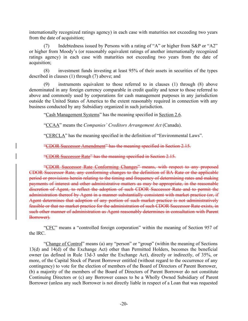 -20- internationally recognized ratings agency) in each case with maturities not exceeding two years from the date of acquisition; (7) Indebtedness issued by Persons with a rating of “A” or higher from S&P or “A2” or higher from Moody’s (or reasonably equivalent ratings of another internationally recognized ratings agency) in each case with maturities not exceeding two years from the date of acquisition; (8) investment funds investing at least 95% of their assets in securities of the types described in clauses (1) through (7) above; and (9) instruments equivalent to those referred to in clauses (1) through (8) above denominated in any foreign currency comparable in credit quality and tenor to those referred to above and commonly used by corporations for cash management purposes in any jurisdiction outside the United States of America to the extent reasonably required in connection with any business conducted by any Subsidiary organized in such jurisdiction. “Cash Management Systems” has the meaning specified in Section 2.6. “CCAA” means the Companies’ Creditors Arrangement Act (Canada). “CERCLA” has the meaning specified in the definition of “Environmental Laws”. “CDOR Successor Amendment” has the meaning specified in Section 2.15. “CDOR Successor Rate” has the meaning specified in Section 2.15. “CDOR Successor Rate Conforming Changes” means, with respect to any proposed CDOR Successor Rate, any conforming changes to the definition of BA Rate or the applicable period or provisions herein relating to the timing and frequency of determining rates and making payments of interest and other administrative matters as may be appropriate, in the reasonable discretion of Agent, to reflect the adoption of such CDOR Successor Rate and to permit the administration thereof by Agent in a manner substantially consistent with market practice (or, if Agent determines that adoption of any portion of such market practice is not administratively feasible or that no market practice for the administration of such CDOR Successor Rate exists, in such other manner of administration as Agent reasonably determines in consultation with Parent Borrower). “CFC” means a “controlled foreign corporation” within the meaning of Section 957 of the IRC. “Change of Control” means (a) any “person” or “group” (within the meaning of Sections 13(d) and 14(d) of the Exchange Act) other than Permitted Holders, becomes the beneficial owner (as defined in Rule 13d-3 under the Exchange Act), directly or indirectly, of 35%, or more, of the Capital Stock of Parent Borrower entitled (without regard to the occurrence of any contingency) to vote for the election of members of the Board of Directors of Parent Borrower, (b) a majority of the members of the Board of Directors of Parent Borrower do not constitute Continuing Directors or (c) any Borrower ceases to be a Wholly Owned Subsidiary of Parent Borrower (unless any such Borrower is not directly liable in respect of a Loan that was requested