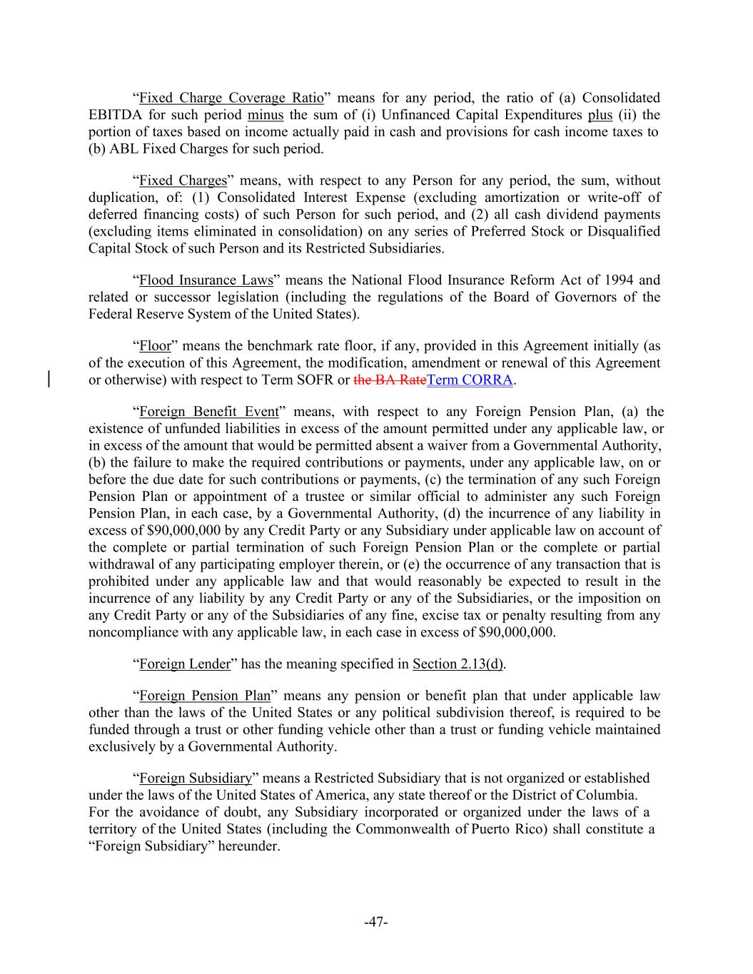 -47- “Fixed Charge Coverage Ratio” means for any period, the ratio of (a) Consolidated EBITDA for such period minus the sum of (i) Unfinanced Capital Expenditures plus (ii) the portion of taxes based on income actually paid in cash and provisions for cash income taxes to (b) ABL Fixed Charges for such period. “Fixed Charges” means, with respect to any Person for any period, the sum, without duplication, of: (1) Consolidated Interest Expense (excluding amortization or write-off of deferred financing costs) of such Person for such period, and (2) all cash dividend payments (excluding items eliminated in consolidation) on any series of Preferred Stock or Disqualified Capital Stock of such Person and its Restricted Subsidiaries. “Flood Insurance Laws” means the National Flood Insurance Reform Act of 1994 and related or successor legislation (including the regulations of the Board of Governors of the Federal Reserve System of the United States). “Floor” means the benchmark rate floor, if any, provided in this Agreement initially (as of the execution of this Agreement, the modification, amendment or renewal of this Agreement or otherwise) with respect to Term SOFR or the BA RateTerm CORRA. “Foreign Benefit Event” means, with respect to any Foreign Pension Plan, (a) the existence of unfunded liabilities in excess of the amount permitted under any applicable law, or in excess of the amount that would be permitted absent a waiver from a Governmental Authority, (b) the failure to make the required contributions or payments, under any applicable law, on or before the due date for such contributions or payments, (c) the termination of any such Foreign Pension Plan or appointment of a trustee or similar official to administer any such Foreign Pension Plan, in each case, by a Governmental Authority, (d) the incurrence of any liability in excess of $90,000,000 by any Credit Party or any Subsidiary under applicable law on account of the complete or partial termination of such Foreign Pension Plan or the complete or partial withdrawal of any participating employer therein, or (e) the occurrence of any transaction that is prohibited under any applicable law and that would reasonably be expected to result in the incurrence of any liability by any Credit Party or any of the Subsidiaries, or the imposition on any Credit Party or any of the Subsidiaries of any fine, excise tax or penalty resulting from any noncompliance with any applicable law, in each case in excess of $90,000,000. “Foreign Lender” has the meaning specified in Section 2.13(d). “Foreign Pension Plan” means any pension or benefit plan that under applicable law other than the laws of the United States or any political subdivision thereof, is required to be funded through a trust or other funding vehicle other than a trust or funding vehicle maintained exclusively by a Governmental Authority. “Foreign Subsidiary” means a Restricted Subsidiary that is not organized or established under the laws of the United States of America, any state thereof or the District of Columbia. For the avoidance of doubt, any Subsidiary incorporated or organized under the laws of a territory of the United States (including the Commonwealth of Puerto Rico) shall constitute a “Foreign Subsidiary” hereunder.