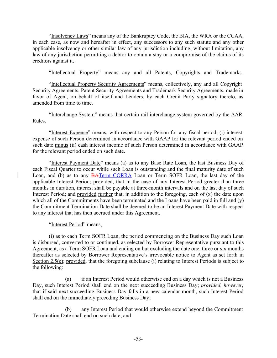 -53- “Insolvency Laws” means any of the Bankruptcy Code, the BIA, the WRA or the CCAA, in each case, as now and hereafter in effect, any successors to any such statute and any other applicable insolvency or other similar law of any jurisdiction including, without limitation, any law of any jurisdiction permitting a debtor to obtain a stay or a compromise of the claims of its creditors against it. “Intellectual Property” means any and all Patents, Copyrights and Trademarks. “Intellectual Property Security Agreements” means, collectively, any and all Copyright Security Agreements, Patent Security Agreements and Trademark Security Agreements, made in favor of Agent, on behalf of itself and Lenders, by each Credit Party signatory thereto, as amended from time to time. “Interchange System” means that certain rail interchange system governed by the AAR Rules. “Interest Expense” means, with respect to any Person for any fiscal period, (i) interest expense of such Person determined in accordance with GAAP for the relevant period ended on such date minus (ii) cash interest income of such Person determined in accordance with GAAP for the relevant period ended on such date. “Interest Payment Date” means (a) as to any Base Rate Loan, the last Business Day of each Fiscal Quarter to occur while such Loan is outstanding and the final maturity date of such Loan, and (b) as to any BATerm CORRA Loan or Term SOFR Loan, the last day of the applicable Interest Period; provided, that in the case of any Interest Period greater than three months in duration, interest shall be payable at three-month intervals and on the last day of such Interest Period; and provided further that, in addition to the foregoing, each of (x) the date upon which all of the Commitments have been terminated and the Loans have been paid in full and (y) the Commitment Termination Date shall be deemed to be an Interest Payment Date with respect to any interest that has then accrued under this Agreement. “Interest Period” means, (i) as to each Term SOFR Loan, the period commencing on the Business Day such Loan is disbursed, converted to or continued, as selected by Borrower Representative pursuant to this Agreement, as a Term SOFR Loan and ending on but excluding the date one, three or six months thereafter as selected by Borrower Representative’s irrevocable notice to Agent as set forth in Section 2.5(e); provided, that the foregoing subclause (i) relating to Interest Periods is subject to the following: (a) if an Interest Period would otherwise end on a day which is not a Business Day, such Interest Period shall end on the next succeeding Business Day; provided, however, that if said next succeeding Business Day falls in a new calendar month, such Interest Period shall end on the immediately preceding Business Day; (b) any Interest Period that would otherwise extend beyond the Commitment Termination Date shall end on such date; and