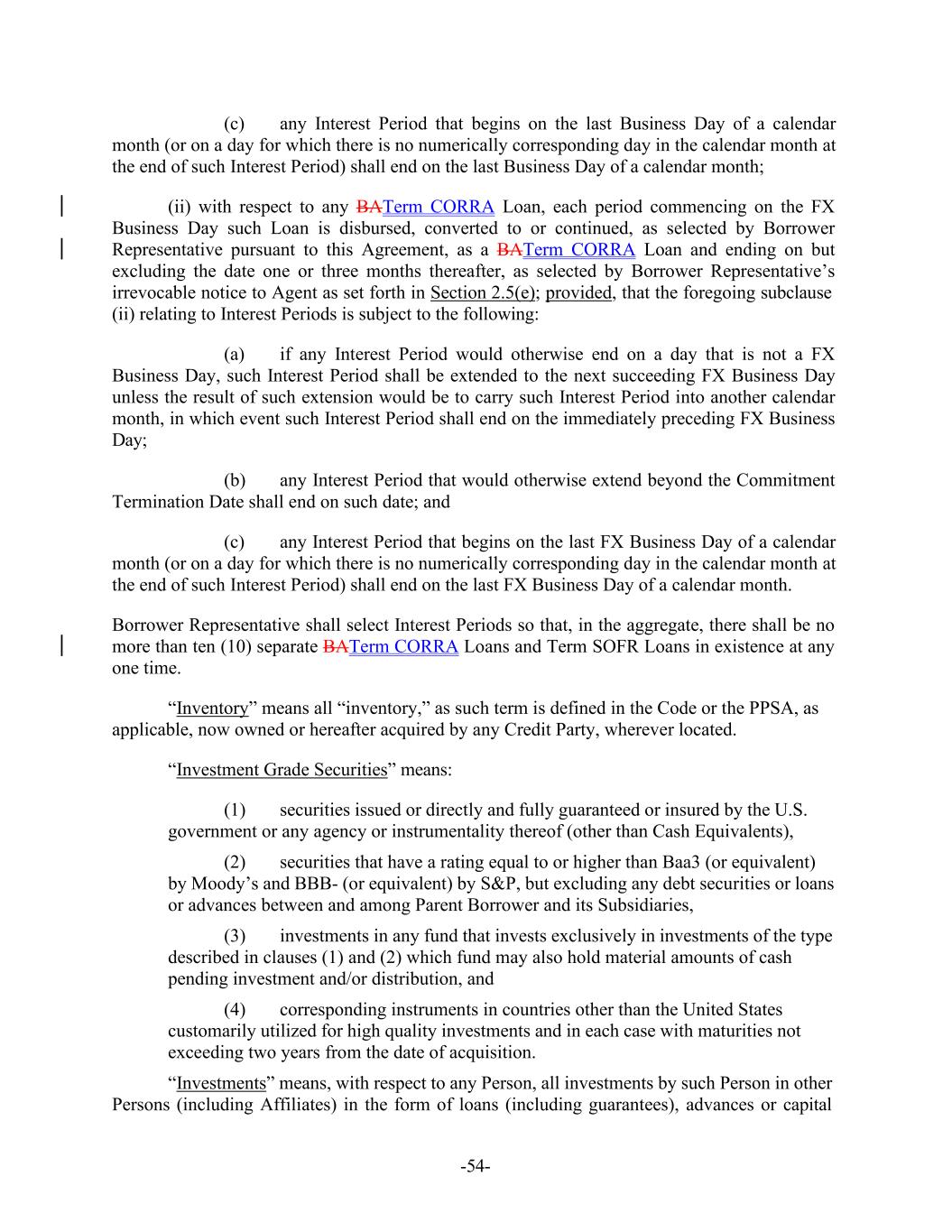 -54- (c) any Interest Period that begins on the last Business Day of a calendar month (or on a day for which there is no numerically corresponding day in the calendar month at the end of such Interest Period) shall end on the last Business Day of a calendar month; (ii) with respect to any BATerm CORRA Loan, each period commencing on the FX Business Day such Loan is disbursed, converted to or continued, as selected by Borrower Representative pursuant to this Agreement, as a BATerm CORRA Loan and ending on but excluding the date one or three months thereafter, as selected by Borrower Representative’s irrevocable notice to Agent as set forth in Section 2.5(e); provided, that the foregoing subclause (ii) relating to Interest Periods is subject to the following: (a) if any Interest Period would otherwise end on a day that is not a FX Business Day, such Interest Period shall be extended to the next succeeding FX Business Day unless the result of such extension would be to carry such Interest Period into another calendar month, in which event such Interest Period shall end on the immediately preceding FX Business Day; (b) any Interest Period that would otherwise extend beyond the Commitment Termination Date shall end on such date; and (c) any Interest Period that begins on the last FX Business Day of a calendar month (or on a day for which there is no numerically corresponding day in the calendar month at the end of such Interest Period) shall end on the last FX Business Day of a calendar month. Borrower Representative shall select Interest Periods so that, in the aggregate, there shall be no more than ten (10) separate BATerm CORRA Loans and Term SOFR Loans in existence at any one time. “Inventory” means all “inventory,” as such term is defined in the Code or the PPSA, as applicable, now owned or hereafter acquired by any Credit Party, wherever located. “Investment Grade Securities” means: (1) securities issued or directly and fully guaranteed or insured by the U.S. government or any agency or instrumentality thereof (other than Cash Equivalents), (2) securities that have a rating equal to or higher than Baa3 (or equivalent) by Moody’s and BBB- (or equivalent) by S&P, but excluding any debt securities or loans or advances between and among Parent Borrower and its Subsidiaries, (3) investments in any fund that invests exclusively in investments of the type described in clauses (1) and (2) which fund may also hold material amounts of cash pending investment and/or distribution, and (4) corresponding instruments in countries other than the United States customarily utilized for high quality investments and in each case with maturities not exceeding two years from the date of acquisition. “Investments” means, with respect to any Person, all investments by such Person in other Persons (including Affiliates) in the form of loans (including guarantees), advances or capital
