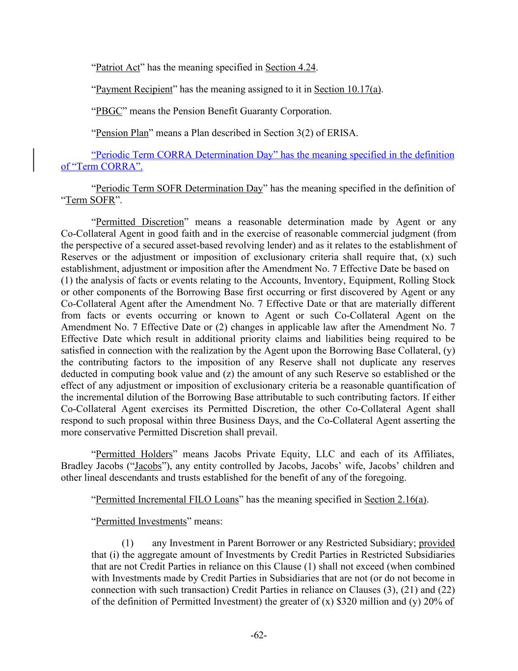 -62- “Patriot Act” has the meaning specified in Section 4.24. “Payment Recipient” has the meaning assigned to it in Section 10.17(a). “PBGC” means the Pension Benefit Guaranty Corporation. “Pension Plan” means a Plan described in Section 3(2) of ERISA. “Periodic Term CORRA Determination Day” has the meaning specified in the definition of “Term CORRA”. “Periodic Term SOFR Determination Day” has the meaning specified in the definition of “Term SOFR”. “Permitted Discretion” means a reasonable determination made by Agent or any Co-Collateral Agent in good faith and in the exercise of reasonable commercial judgment (from the perspective of a secured asset-based revolving lender) and as it relates to the establishment of Reserves or the adjustment or imposition of exclusionary criteria shall require that, (x) such establishment, adjustment or imposition after the Amendment No. 7 Effective Date be based on (1) the analysis of facts or events relating to the Accounts, Inventory, Equipment, Rolling Stock or other components of the Borrowing Base first occurring or first discovered by Agent or any Co-Collateral Agent after the Amendment No. 7 Effective Date or that are materially different from facts or events occurring or known to Agent or such Co-Collateral Agent on the Amendment No. 7 Effective Date or (2) changes in applicable law after the Amendment No. 7 Effective Date which result in additional priority claims and liabilities being required to be satisfied in connection with the realization by the Agent upon the Borrowing Base Collateral, (y) the contributing factors to the imposition of any Reserve shall not duplicate any reserves deducted in computing book value and (z) the amount of any such Reserve so established or the effect of any adjustment or imposition of exclusionary criteria be a reasonable quantification of the incremental dilution of the Borrowing Base attributable to such contributing factors. If either Co-Collateral Agent exercises its Permitted Discretion, the other Co-Collateral Agent shall respond to such proposal within three Business Days, and the Co-Collateral Agent asserting the more conservative Permitted Discretion shall prevail. “Permitted Holders” means Jacobs Private Equity, LLC and each of its Affiliates, Bradley Jacobs (“Jacobs”), any entity controlled by Jacobs, Jacobs’ wife, Jacobs’ children and other lineal descendants and trusts established for the benefit of any of the foregoing. “Permitted Incremental FILO Loans” has the meaning specified in Section 2.16(a). “Permitted Investments” means: (1) any Investment in Parent Borrower or any Restricted Subsidiary; provided that (i) the aggregate amount of Investments by Credit Parties in Restricted Subsidiaries that are not Credit Parties in reliance on this Clause (1) shall not exceed (when combined with Investments made by Credit Parties in Subsidiaries that are not (or do not become in connection with such transaction) Credit Parties in reliance on Clauses (3), (21) and (22) of the definition of Permitted Investment) the greater of (x) $320 million and (y) 20% of