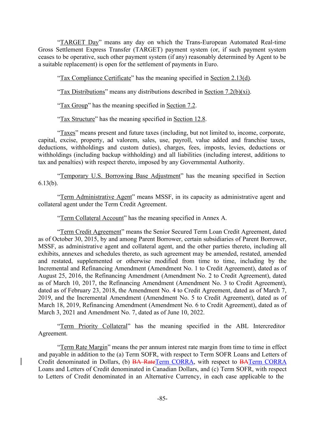 -85- “TARGET Day” means any day on which the Trans-European Automated Real-time Gross Settlement Express Transfer (TARGET) payment system (or, if such payment system ceases to be operative, such other payment system (if any) reasonably determined by Agent to be a suitable replacement) is open for the settlement of payments in Euro. “Tax Compliance Certificate” has the meaning specified in Section 2.13(d). “Tax Distributions” means any distributions described in Section 7.2(b)(xi). “Tax Group” has the meaning specified in Section 7.2. “Tax Structure” has the meaning specified in Section 12.8. “Taxes” means present and future taxes (including, but not limited to, income, corporate, capital, excise, property, ad valorem, sales, use, payroll, value added and franchise taxes, deductions, withholdings and custom duties), charges, fees, imposts, levies, deductions or withholdings (including backup withholding) and all liabilities (including interest, additions to tax and penalties) with respect thereto, imposed by any Governmental Authority. “Temporary U.S. Borrowing Base Adjustment” has the meaning specified in Section 6.13(b). “Term Administrative Agent” means MSSF, in its capacity as administrative agent and collateral agent under the Term Credit Agreement. “Term Collateral Account” has the meaning specified in Annex A. “Term Credit Agreement” means the Senior Secured Term Loan Credit Agreement, dated as of October 30, 2015, by and among Parent Borrower, certain subsidiaries of Parent Borrower, MSSF, as administrative agent and collateral agent, and the other parties thereto, including all exhibits, annexes and schedules thereto, as such agreement may be amended, restated, amended and restated, supplemented or otherwise modified from time to time, including by the Incremental and Refinancing Amendment (Amendment No. 1 to Credit Agreement), dated as of August 25, 2016, the Refinancing Amendment (Amendment No. 2 to Credit Agreement), dated as of March 10, 2017, the Refinancing Amendment (Amendment No. 3 to Credit Agreement), dated as of February 23, 2018, the Amendment No. 4 to Credit Agreement, dated as of March 7, 2019, and the Incremental Amendment (Amendment No. 5 to Credit Agreement), dated as of March 18, 2019, Refinancing Amendment (Amendment No. 6 to Credit Agreement), dated as of March 3, 2021 and Amendment No. 7, dated as of June 10, 2022. “Term Priority Collateral” has the meaning specified in the ABL Intercreditor Agreement. “Term Rate Margin” means the per annum interest rate margin from time to time in effect and payable in addition to the (a) Term SOFR, with respect to Term SOFR Loans and Letters of Credit denominated in Dollars, (b) BA RateTerm CORRA, with respect to BATerm CORRA Loans and Letters of Credit denominated in Canadian Dollars, and (c) Term SOFR, with respect to Letters of Credit denominated in an Alternative Currency, in each case applicable to the
