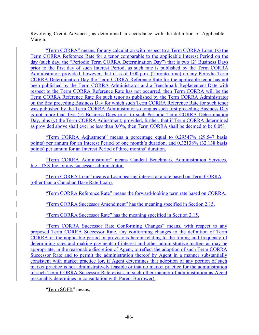 -86- Revolving Credit Advances, as determined in accordance with the definition of Applicable Margin. “Term CORRA” means, for any calculation with respect to a Term CORRA Loan, (x) the Term CORRA Reference Rate for a tenor comparable to the applicable Interest Period on the day (such day, the “Periodic Term CORRA Determination Day”) that is two (2) Business Days prior to the first day of such Interest Period, as such rate is published by the Term CORRA Administrator; provided, however, that if as of 1:00 p.m. (Toronto time) on any Periodic Term CORRA Determination Day the Term CORRA Reference Rate for the applicable tenor has not been published by the Term CORRA Administrator and a Benchmark Replacement Date with respect to the Term CORRA Reference Rate has not occurred, then Term CORRA will be the Term CORRA Reference Rate for such tenor as published by the Term CORRA Administrator on the first preceding Business Day for which such Term CORRA Reference Rate for such tenor was published by the Term CORRA Administrator so long as such first preceding Business Day is not more than five (5) Business Days prior to such Periodic Term CORRA Determination Day, plus (y) the Term CORRA Adjustment; provided, further, that if Term CORRA determined as provided above shall ever be less than 0.0%, then Term CORRA shall be deemed to be 0.0%. “Term CORRA Adjustment” means a percentage equal to 0.29547% (29.547 basis points) per annum for an Interest Period of one month’s duration, and 0.32138% (32.138 basis points) per annum for an Interest Period of three months’ duration. “Term CORRA Administrator” means Candeal Benchmark Administration Services, Inc., TSX Inc. or any successor administrator. “Term CORRA Loan” means a Loan bearing interest at a rate based on Term CORRA (other than a Canadian Base Rate Loan). “Term CORRA Reference Rate” means the forward-looking term rate based on CORRA. “Term CORRA Successor Amendment” has the meaning specified in Section 2.15. “Term CORRA Successor Rate” has the meaning specified in Section 2.15. “Term CORRA Successor Rate Conforming Changes” means, with respect to any proposed Term CORRA Successor Rate, any conforming changes to the definition of Term CORRA or the applicable period or provisions herein relating to the timing and frequency of determining rates and making payments of interest and other administrative matters as may be appropriate, in the reasonable discretion of Agent, to reflect the adoption of such Term CORRA Successor Rate and to permit the administration thereof by Agent in a manner substantially consistent with market practice (or, if Agent determines that adoption of any portion of such market practice is not administratively feasible or that no market practice for the administration of such Term CORRA Successor Rate exists, in such other manner of administration as Agent reasonably determines in consultation with Parent Borrower). “Term SOFR” means,