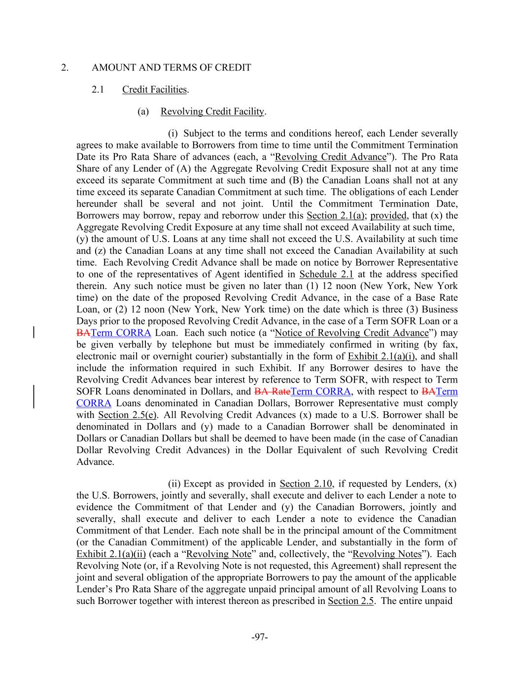 -97- 2. AMOUNT AND TERMS OF CREDIT 2.1 Credit Facilities. (a) Revolving Credit Facility. (i) Subject to the terms and conditions hereof, each Lender severally agrees to make available to Borrowers from time to time until the Commitment Termination Date its Pro Rata Share of advances (each, a “Revolving Credit Advance”). The Pro Rata Share of any Lender of (A) the Aggregate Revolving Credit Exposure shall not at any time exceed its separate Commitment at such time and (B) the Canadian Loans shall not at any time exceed its separate Canadian Commitment at such time. The obligations of each Lender hereunder shall be several and not joint. Until the Commitment Termination Date, Borrowers may borrow, repay and reborrow under this Section 2.1(a); provided, that (x) the Aggregate Revolving Credit Exposure at any time shall not exceed Availability at such time, (y) the amount of U.S. Loans at any time shall not exceed the U.S. Availability at such time and (z) the Canadian Loans at any time shall not exceed the Canadian Availability at such time. Each Revolving Credit Advance shall be made on notice by Borrower Representative to one of the representatives of Agent identified in Schedule 2.1 at the address specified therein. Any such notice must be given no later than (1) 12 noon (New York, New York time) on the date of the proposed Revolving Credit Advance, in the case of a Base Rate Loan, or (2) 12 noon (New York, New York time) on the date which is three (3) Business Days prior to the proposed Revolving Credit Advance, in the case of a Term SOFR Loan or a BATerm CORRA Loan. Each such notice (a “Notice of Revolving Credit Advance”) may be given verbally by telephone but must be immediately confirmed in writing (by fax, electronic mail or overnight courier) substantially in the form of Exhibit 2.1(a)(i), and shall include the information required in such Exhibit. If any Borrower desires to have the Revolving Credit Advances bear interest by reference to Term SOFR, with respect to Term SOFR Loans denominated in Dollars, and BA RateTerm CORRA, with respect to BATerm CORRA Loans denominated in Canadian Dollars, Borrower Representative must comply with Section 2.5(e). All Revolving Credit Advances (x) made to a U.S. Borrower shall be denominated in Dollars and (y) made to a Canadian Borrower shall be denominated in Dollars or Canadian Dollars but shall be deemed to have been made (in the case of Canadian Dollar Revolving Credit Advances) in the Dollar Equivalent of such Revolving Credit Advance. (ii) Except as provided in Section 2.10, if requested by Lenders, (x) the U.S. Borrowers, jointly and severally, shall execute and deliver to each Lender a note to evidence the Commitment of that Lender and (y) the Canadian Borrowers, jointly and severally, shall execute and deliver to each Lender a note to evidence the Canadian Commitment of that Lender. Each note shall be in the principal amount of the Commitment (or the Canadian Commitment) of the applicable Lender, and substantially in the form of Exhibit 2.1(a)(ii) (each a “Revolving Note” and, collectively, the “Revolving Notes”). Each Revolving Note (or, if a Revolving Note is not requested, this Agreement) shall represent the joint and several obligation of the appropriate Borrowers to pay the amount of the applicable Lender’s Pro Rata Share of the aggregate unpaid principal amount of all Revolving Loans to such Borrower together with interest thereon as prescribed in Section 2.5. The entire unpaid