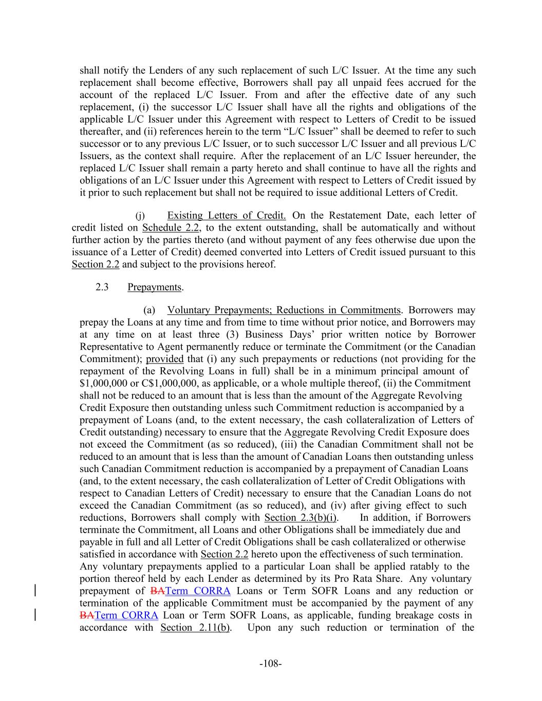 -108- shall notify the Lenders of any such replacement of such L/C Issuer. At the time any such replacement shall become effective, Borrowers shall pay all unpaid fees accrued for the account of the replaced L/C Issuer. From and after the effective date of any such replacement, (i) the successor L/C Issuer shall have all the rights and obligations of the applicable L/C Issuer under this Agreement with respect to Letters of Credit to be issued thereafter, and (ii) references herein to the term “L/C Issuer” shall be deemed to refer to such successor or to any previous L/C Issuer, or to such successor L/C Issuer and all previous L/C Issuers, as the context shall require. After the replacement of an L/C Issuer hereunder, the replaced L/C Issuer shall remain a party hereto and shall continue to have all the rights and obligations of an L/C Issuer under this Agreement with respect to Letters of Credit issued by it prior to such replacement but shall not be required to issue additional Letters of Credit. (j) Existing Letters of Credit. On the Restatement Date, each letter of credit listed on Schedule 2.2, to the extent outstanding, shall be automatically and without further action by the parties thereto (and without payment of any fees otherwise due upon the issuance of a Letter of Credit) deemed converted into Letters of Credit issued pursuant to this Section 2.2 and subject to the provisions hereof. 2.3 Prepayments. (a) Voluntary Prepayments; Reductions in Commitments. Borrowers may prepay the Loans at any time and from time to time without prior notice, and Borrowers may at any time on at least three (3) Business Days’ prior written notice by Borrower Representative to Agent permanently reduce or terminate the Commitment (or the Canadian Commitment); provided that (i) any such prepayments or reductions (not providing for the repayment of the Revolving Loans in full) shall be in a minimum principal amount of $1,000,000 or C$1,000,000, as applicable, or a whole multiple thereof, (ii) the Commitment shall not be reduced to an amount that is less than the amount of the Aggregate Revolving Credit Exposure then outstanding unless such Commitment reduction is accompanied by a prepayment of Loans (and, to the extent necessary, the cash collateralization of Letters of Credit outstanding) necessary to ensure that the Aggregate Revolving Credit Exposure does not exceed the Commitment (as so reduced), (iii) the Canadian Commitment shall not be reduced to an amount that is less than the amount of Canadian Loans then outstanding unless such Canadian Commitment reduction is accompanied by a prepayment of Canadian Loans (and, to the extent necessary, the cash collateralization of Letter of Credit Obligations with respect to Canadian Letters of Credit) necessary to ensure that the Canadian Loans do not exceed the Canadian Commitment (as so reduced), and (iv) after giving effect to such reductions, Borrowers shall comply with Section 2.3(b)(i). In addition, if Borrowers terminate the Commitment, all Loans and other Obligations shall be immediately due and payable in full and all Letter of Credit Obligations shall be cash collateralized or otherwise satisfied in accordance with Section 2.2 hereto upon the effectiveness of such termination. Any voluntary prepayments applied to a particular Loan shall be applied ratably to the portion thereof held by each Lender as determined by its Pro Rata Share. Any voluntary prepayment of BATerm CORRA Loans or Term SOFR Loans and any reduction or termination of the applicable Commitment must be accompanied by the payment of any BATerm CORRA Loan or Term SOFR Loans, as applicable, funding breakage costs in accordance with Section 2.11(b). Upon any such reduction or termination of the