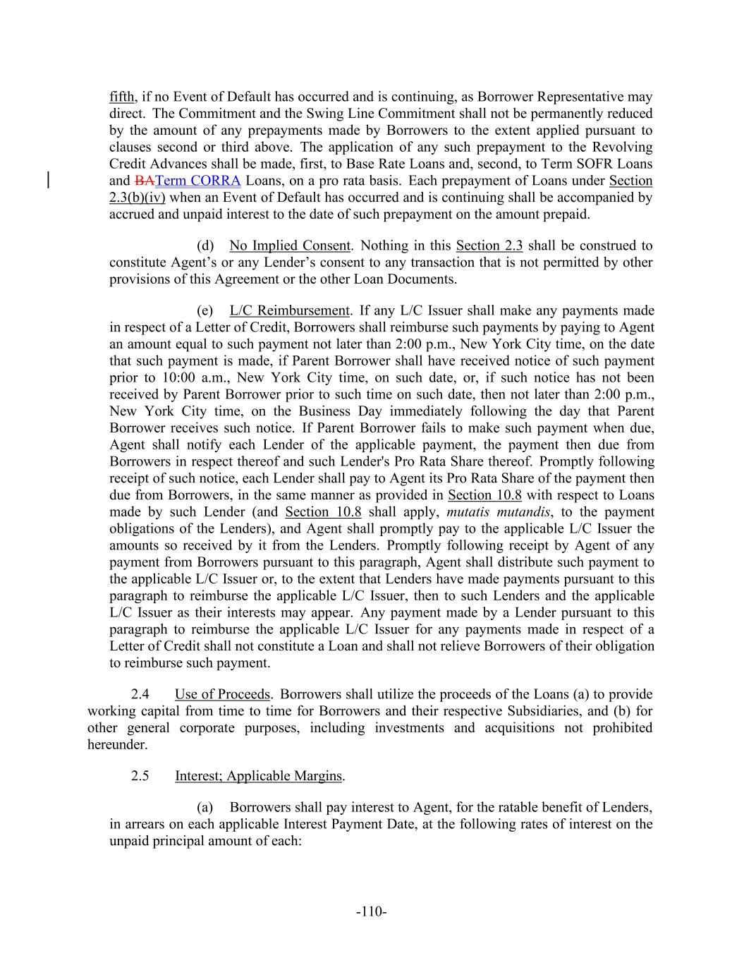 -110- fifth, if no Event of Default has occurred and is continuing, as Borrower Representative may direct. The Commitment and the Swing Line Commitment shall not be permanently reduced by the amount of any prepayments made by Borrowers to the extent applied pursuant to clauses second or third above. The application of any such prepayment to the Revolving Credit Advances shall be made, first, to Base Rate Loans and, second, to Term SOFR Loans and BATerm CORRA Loans, on a pro rata basis. Each prepayment of Loans under Section 2.3(b)(iv) when an Event of Default has occurred and is continuing shall be accompanied by accrued and unpaid interest to the date of such prepayment on the amount prepaid. (d) No Implied Consent. Nothing in this Section 2.3 shall be construed to constitute Agent’s or any Lender’s consent to any transaction that is not permitted by other provisions of this Agreement or the other Loan Documents. (e) L/C Reimbursement. If any L/C Issuer shall make any payments made in respect of a Letter of Credit, Borrowers shall reimburse such payments by paying to Agent an amount equal to such payment not later than 2:00 p.m., New York City time, on the date that such payment is made, if Parent Borrower shall have received notice of such payment prior to 10:00 a.m., New York City time, on such date, or, if such notice has not been received by Parent Borrower prior to such time on such date, then not later than 2:00 p.m., New York City time, on the Business Day immediately following the day that Parent Borrower receives such notice. If Parent Borrower fails to make such payment when due, Agent shall notify each Lender of the applicable payment, the payment then due from Borrowers in respect thereof and such Lender's Pro Rata Share thereof. Promptly following receipt of such notice, each Lender shall pay to Agent its Pro Rata Share of the payment then due from Borrowers, in the same manner as provided in Section 10.8 with respect to Loans made by such Lender (and Section 10.8 shall apply, mutatis mutandis, to the payment obligations of the Lenders), and Agent shall promptly pay to the applicable L/C Issuer the amounts so received by it from the Lenders. Promptly following receipt by Agent of any payment from Borrowers pursuant to this paragraph, Agent shall distribute such payment to the applicable L/C Issuer or, to the extent that Lenders have made payments pursuant to this paragraph to reimburse the applicable L/C Issuer, then to such Lenders and the applicable L/C Issuer as their interests may appear. Any payment made by a Lender pursuant to this paragraph to reimburse the applicable L/C Issuer for any payments made in respect of a Letter of Credit shall not constitute a Loan and shall not relieve Borrowers of their obligation to reimburse such payment. 2.4 Use of Proceeds. Borrowers shall utilize the proceeds of the Loans (a) to provide working capital from time to time for Borrowers and their respective Subsidiaries, and (b) for other general corporate purposes, including investments and acquisitions not prohibited hereunder. 2.5 Interest; Applicable Margins. (a) Borrowers shall pay interest to Agent, for the ratable benefit of Lenders, in arrears on each applicable Interest Payment Date, at the following rates of interest on the unpaid principal amount of each: