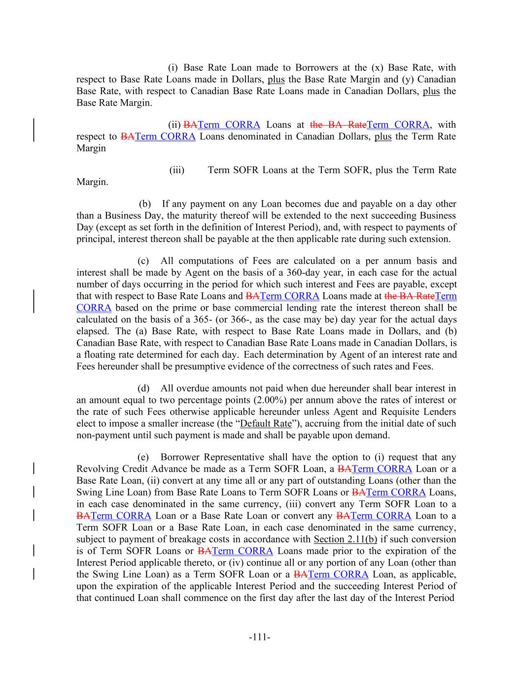 -111- (i) Base Rate Loan made to Borrowers at the (x) Base Rate, with respect to Base Rate Loans made in Dollars, plus the Base Rate Margin and (y) Canadian Base Rate, with respect to Canadian Base Rate Loans made in Canadian Dollars, plus the Base Rate Margin. (ii) BATerm CORRA Loans at the BA RateTerm CORRA, with respect to BATerm CORRA Loans denominated in Canadian Dollars, plus the Term Rate Margin Margin. (iii) Term SOFR Loans at the Term SOFR, plus the Term Rate (b) If any payment on any Loan becomes due and payable on a day other than a Business Day, the maturity thereof will be extended to the next succeeding Business Day (except as set forth in the definition of Interest Period), and, with respect to payments of principal, interest thereon shall be payable at the then applicable rate during such extension. (c) All computations of Fees are calculated on a per annum basis and interest shall be made by Agent on the basis of a 360-day year, in each case for the actual number of days occurring in the period for which such interest and Fees are payable, except that with respect to Base Rate Loans and BATerm CORRA Loans made at the BA RateTerm CORRA based on the prime or base commercial lending rate the interest thereon shall be calculated on the basis of a 365- (or 366-, as the case may be) day year for the actual days elapsed. The (a) Base Rate, with respect to Base Rate Loans made in Dollars, and (b) Canadian Base Rate, with respect to Canadian Base Rate Loans made in Canadian Dollars, is a floating rate determined for each day. Each determination by Agent of an interest rate and Fees hereunder shall be presumptive evidence of the correctness of such rates and Fees. (d) All overdue amounts not paid when due hereunder shall bear interest in an amount equal to two percentage points (2.00%) per annum above the rates of interest or the rate of such Fees otherwise applicable hereunder unless Agent and Requisite Lenders elect to impose a smaller increase (the “Default Rate”), accruing from the initial date of such non-payment until such payment is made and shall be payable upon demand. (e) Borrower Representative shall have the option to (i) request that any Revolving Credit Advance be made as a Term SOFR Loan, a BATerm CORRA Loan or a Base Rate Loan, (ii) convert at any time all or any part of outstanding Loans (other than the Swing Line Loan) from Base Rate Loans to Term SOFR Loans or BATerm CORRA Loans, in each case denominated in the same currency, (iii) convert any Term SOFR Loan to a BATerm CORRA Loan or a Base Rate Loan or convert any BATerm CORRA Loan to a Term SOFR Loan or a Base Rate Loan, in each case denominated in the same currency, subject to payment of breakage costs in accordance with Section 2.11(b) if such conversion is of Term SOFR Loans or BATerm CORRA Loans made prior to the expiration of the Interest Period applicable thereto, or (iv) continue all or any portion of any Loan (other than the Swing Line Loan) as a Term SOFR Loan or a BATerm CORRA Loan, as applicable, upon the expiration of the applicable Interest Period and the succeeding Interest Period of that continued Loan shall commence on the first day after the last day of the Interest Period