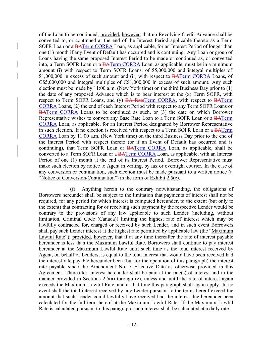 -112- of the Loan to be continued; provided, however, that no Revolving Credit Advance shall be converted to, or continued at the end of the Interest Period applicable thereto as a Term SOFR Loan or a BATerm CORRA Loan, as applicable, for an Interest Period of longer than one (1) month if any Event of Default has occurred and is continuing. Any Loan or group of Loans having the same proposed Interest Period to be made or continued as, or converted into, a Term SOFR Loan or a BATerm CORRA Loan, as applicable, must be in a minimum amount (i) with respect to Term SOFR Loans, of $5,000,000 and integral multiples of $1,000,000 in excess of such amount and (ii) with respect to BATerm CORRA Loans, of C$5,000,000 and integral multiples of C$1,000,000 in excess of such amount. Any such election must be made by 11:00 a.m. (New York time) on the third Business Day prior to (1) the date of any proposed Advance which is to bear interest at the (x) Term SOFR, with respect to Term SOFR Loans, and (y) BA RateTerm CORRA, with respect to BATerm CORRA Loans, (2) the end of each Interest Period with respect to any Term SOFR Loans or BATerm CORRA Loans to be continued as such, or (3) the date on which Borrower Representative wishes to convert any Base Rate Loan to a Term SOFR Loan or a BATerm CORRA Loan, as applicable, for an Interest Period designated by Borrower Representative in such election. If no election is received with respect to a Term SOFR Loan or a BATerm CORRA Loan by 11:00 a.m. (New York time) on the third Business Day prior to the end of the Interest Period with respect thereto (or if an Event of Default has occurred and is continuing), that Term SOFR Loan or BATerm CORRA Loan, as applicable, shall be converted to a Term SOFR Loan or a BATerm CORRA Loan, as applicable, with an Interest Period of one (1) month at the end of its Interest Period. Borrower Representative must make such election by notice to Agent in writing, by fax or overnight courier. In the case of any conversion or continuation, such election must be made pursuant to a written notice (a “Notice of Conversion/Continuation”) in the form of Exhibit 2.5(e). (f) Anything herein to the contrary notwithstanding, the obligations of Borrowers hereunder shall be subject to the limitation that payments of interest shall not be required, for any period for which interest is computed hereunder, to the extent (but only to the extent) that contracting for or receiving such payment by the respective Lender would be contrary to the provisions of any law applicable to such Lender (including, without limitation, Criminal Code (Canada)) limiting the highest rate of interest which may be lawfully contracted for, charged or received by such Lender, and in such event Borrowers shall pay such Lender interest at the highest rate permitted by applicable law (the “Maximum Lawful Rate”); provided, however, that if at any time thereafter the rate of interest payable hereunder is less than the Maximum Lawful Rate, Borrowers shall continue to pay interest hereunder at the Maximum Lawful Rate until such time as the total interest received by Agent, on behalf of Lenders, is equal to the total interest that would have been received had the interest rate payable hereunder been (but for the operation of this paragraph) the interest rate payable since the Amendment No. 7 Effective Date as otherwise provided in this Agreement. Thereafter, interest hereunder shall be paid at the rate(s) of interest and in the manner provided in Sections 2.5(a) through (e), unless and until the rate of interest again exceeds the Maximum Lawful Rate, and at that time this paragraph shall again apply. In no event shall the total interest received by any Lender pursuant to the terms hereof exceed the amount that such Lender could lawfully have received had the interest due hereunder been calculated for the full term hereof at the Maximum Lawful Rate. If the Maximum Lawful Rate is calculated pursuant to this paragraph, such interest shall be calculated at a daily rate