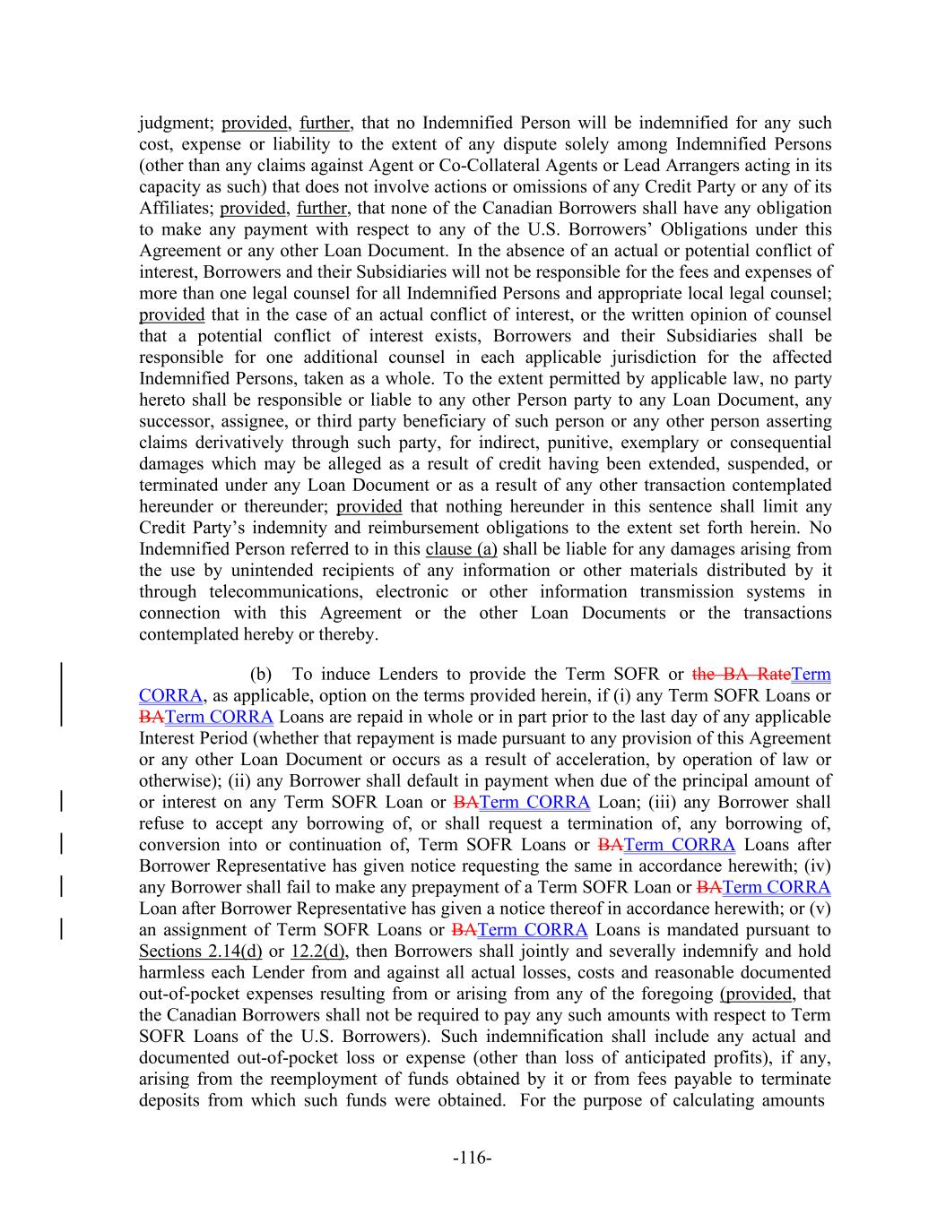 -116- judgment; provided, further, that no Indemnified Person will be indemnified for any such cost, expense or liability to the extent of any dispute solely among Indemnified Persons (other than any claims against Agent or Co-Collateral Agents or Lead Arrangers acting in its capacity as such) that does not involve actions or omissions of any Credit Party or any of its Affiliates; provided, further, that none of the Canadian Borrowers shall have any obligation to make any payment with respect to any of the U.S. Borrowers’ Obligations under this Agreement or any other Loan Document. In the absence of an actual or potential conflict of interest, Borrowers and their Subsidiaries will not be responsible for the fees and expenses of more than one legal counsel for all Indemnified Persons and appropriate local legal counsel; provided that in the case of an actual conflict of interest, or the written opinion of counsel that a potential conflict of interest exists, Borrowers and their Subsidiaries shall be responsible for one additional counsel in each applicable jurisdiction for the affected Indemnified Persons, taken as a whole. To the extent permitted by applicable law, no party hereto shall be responsible or liable to any other Person party to any Loan Document, any successor, assignee, or third party beneficiary of such person or any other person asserting claims derivatively through such party, for indirect, punitive, exemplary or consequential damages which may be alleged as a result of credit having been extended, suspended, or terminated under any Loan Document or as a result of any other transaction contemplated hereunder or thereunder; provided that nothing hereunder in this sentence shall limit any Credit Party’s indemnity and reimbursement obligations to the extent set forth herein. No Indemnified Person referred to in this clause (a) shall be liable for any damages arising from the use by unintended recipients of any information or other materials distributed by it through telecommunications, electronic or other information transmission systems in connection with this Agreement or the other Loan Documents or the transactions contemplated hereby or thereby. (b) To induce Lenders to provide the Term SOFR or the BA RateTerm CORRA, as applicable, option on the terms provided herein, if (i) any Term SOFR Loans or BATerm CORRA Loans are repaid in whole or in part prior to the last day of any applicable Interest Period (whether that repayment is made pursuant to any provision of this Agreement or any other Loan Document or occurs as a result of acceleration, by operation of law or otherwise); (ii) any Borrower shall default in payment when due of the principal amount of or interest on any Term SOFR Loan or BATerm CORRA Loan; (iii) any Borrower shall refuse to accept any borrowing of, or shall request a termination of, any borrowing of, conversion into or continuation of, Term SOFR Loans or BATerm CORRA Loans after Borrower Representative has given notice requesting the same in accordance herewith; (iv) any Borrower shall fail to make any prepayment of a Term SOFR Loan or BATerm CORRA Loan after Borrower Representative has given a notice thereof in accordance herewith; or (v) an assignment of Term SOFR Loans or BATerm CORRA Loans is mandated pursuant to Sections 2.14(d) or 12.2(d), then Borrowers shall jointly and severally indemnify and hold harmless each Lender from and against all actual losses, costs and reasonable documented out-of-pocket expenses resulting from or arising from any of the foregoing (provided, that the Canadian Borrowers shall not be required to pay any such amounts with respect to Term SOFR Loans of the U.S. Borrowers). Such indemnification shall include any actual and documented out-of-pocket loss or expense (other than loss of anticipated profits), if any, arising from the reemployment of funds obtained by it or from fees payable to terminate deposits from which such funds were obtained. For the purpose of calculating amounts