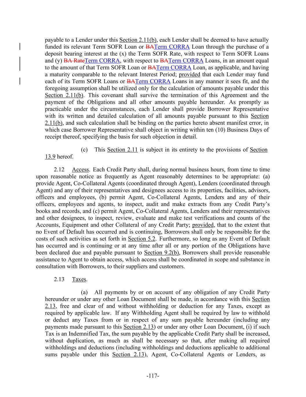 -117- payable to a Lender under this Section 2.11(b), each Lender shall be deemed to have actually funded its relevant Term SOFR Loan or BATerm CORRA Loan through the purchase of a deposit bearing interest at the (x) the Term SOFR Rate, with respect to Term SOFR Loans and (y) BA RateTerm CORRA, with respect to BATerm CORRA Loans, in an amount equal to the amount of that Term SOFR Loan or BATerm CORRA Loan, as applicable, and having a maturity comparable to the relevant Interest Period; provided that each Lender may fund each of its Term SOFR Loans or BATerm CORRA Loans in any manner it sees fit, and the foregoing assumption shall be utilized only for the calculation of amounts payable under this Section 2.11(b). This covenant shall survive the termination of this Agreement and the payment of the Obligations and all other amounts payable hereunder. As promptly as practicable under the circumstances, each Lender shall provide Borrower Representative with its written and detailed calculation of all amounts payable pursuant to this Section 2.11(b), and such calculation shall be binding on the parties hereto absent manifest error, in which case Borrower Representative shall object in writing within ten (10) Business Days of receipt thereof, specifying the basis for such objection in detail. (c) This Section 2.11 is subject in its entirety to the provisions of Section 13.9 hereof. 2.12 Access. Each Credit Party shall, during normal business hours, from time to time upon reasonable notice as frequently as Agent reasonably determines to be appropriate: (a) provide Agent, Co-Collateral Agents (coordinated through Agent), Lenders (coordinated through Agent) and any of their representatives and designees access to its properties, facilities, advisors, officers and employees, (b) permit Agent, Co-Collateral Agents, Lenders and any of their officers, employees and agents, to inspect, audit and make extracts from any Credit Party’s books and records, and (c) permit Agent, Co-Collateral Agents, Lenders and their representatives and other designees, to inspect, review, evaluate and make test verifications and counts of the Accounts, Equipment and other Collateral of any Credit Party; provided, that to the extent that no Event of Default has occurred and is continuing, Borrowers shall only be responsible for the costs of such activities as set forth in Section 5.2. Furthermore, so long as any Event of Default has occurred and is continuing or at any time after all or any portion of the Obligations have been declared due and payable pursuant to Section 9.2(b), Borrowers shall provide reasonable assistance to Agent to obtain access, which access shall be coordinated in scope and substance in consultation with Borrowers, to their suppliers and customers. 2.13 Taxes. (a) All payments by or on account of any obligation of any Credit Party hereunder or under any other Loan Document shall be made, in accordance with this Section 2.13, free and clear of and without withholding or deduction for any Taxes, except as required by applicable law. If any Withholding Agent shall be required by law to withhold or deduct any Taxes from or in respect of any sum payable hereunder (including any payments made pursuant to this Section 2.13) or under any other Loan Document, (i) if such Tax is an Indemnified Tax, the sum payable by the applicable Credit Party shall be increased, without duplication, as much as shall be necessary so that, after making all required withholdings and deductions (including withholdings and deductions applicable to additional sums payable under this Section 2.13), Agent, Co-Collateral Agents or Lenders, as