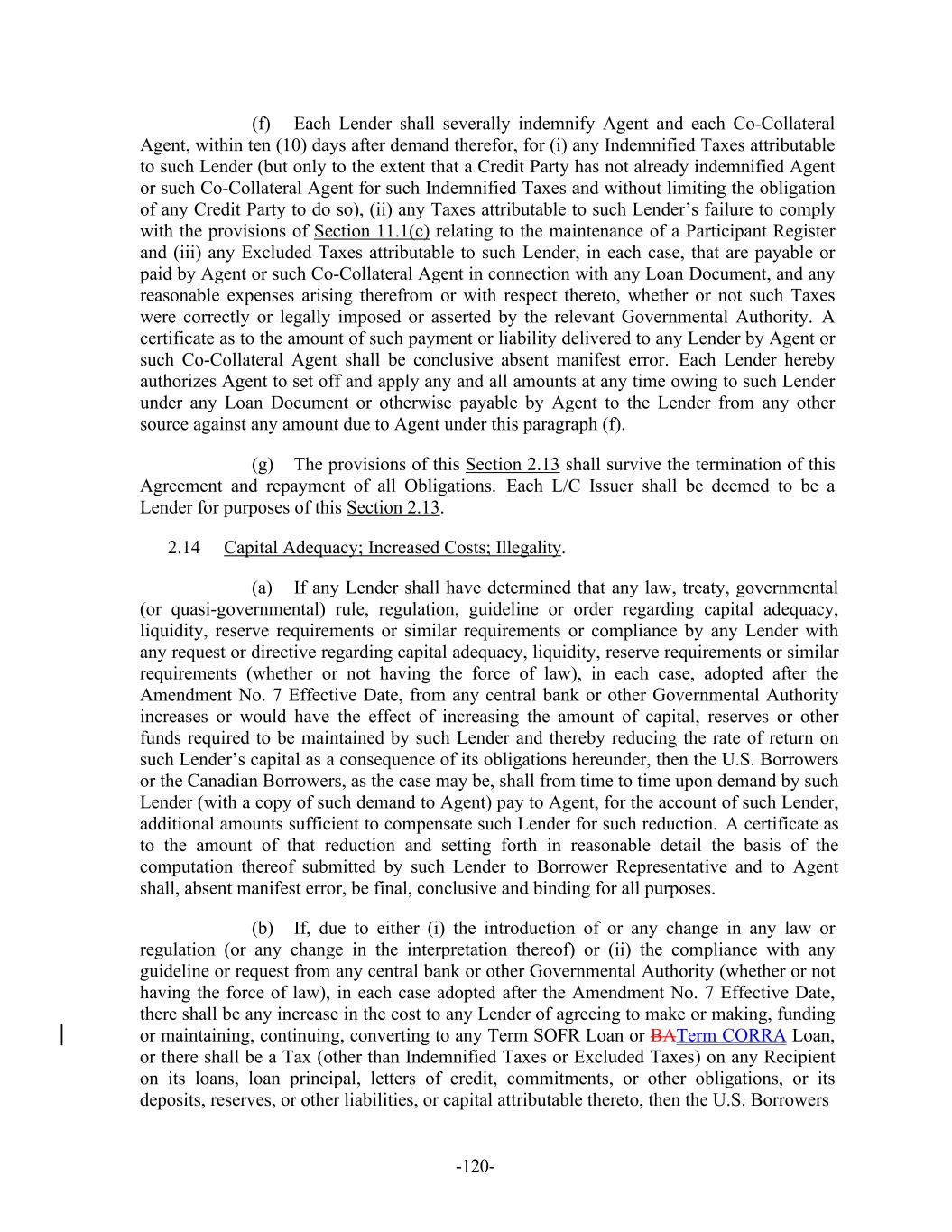 -120- (f) Each Lender shall severally indemnify Agent and each Co-Collateral Agent, within ten (10) days after demand therefor, for (i) any Indemnified Taxes attributable to such Lender (but only to the extent that a Credit Party has not already indemnified Agent or such Co-Collateral Agent for such Indemnified Taxes and without limiting the obligation of any Credit Party to do so), (ii) any Taxes attributable to such Lender’s failure to comply with the provisions of Section 11.1(c) relating to the maintenance of a Participant Register and (iii) any Excluded Taxes attributable to such Lender, in each case, that are payable or paid by Agent or such Co-Collateral Agent in connection with any Loan Document, and any reasonable expenses arising therefrom or with respect thereto, whether or not such Taxes were correctly or legally imposed or asserted by the relevant Governmental Authority. A certificate as to the amount of such payment or liability delivered to any Lender by Agent or such Co-Collateral Agent shall be conclusive absent manifest error. Each Lender hereby authorizes Agent to set off and apply any and all amounts at any time owing to such Lender under any Loan Document or otherwise payable by Agent to the Lender from any other source against any amount due to Agent under this paragraph (f). (g) The provisions of this Section 2.13 shall survive the termination of this Agreement and repayment of all Obligations. Each L/C Issuer shall be deemed to be a Lender for purposes of this Section 2.13. 2.14 Capital Adequacy; Increased Costs; Illegality. (a) If any Lender shall have determined that any law, treaty, governmental (or quasi-governmental) rule, regulation, guideline or order regarding capital adequacy, liquidity, reserve requirements or similar requirements or compliance by any Lender with any request or directive regarding capital adequacy, liquidity, reserve requirements or similar requirements (whether or not having the force of law), in each case, adopted after the Amendment No. 7 Effective Date, from any central bank or other Governmental Authority increases or would have the effect of increasing the amount of capital, reserves or other funds required to be maintained by such Lender and thereby reducing the rate of return on such Lender’s capital as a consequence of its obligations hereunder, then the U.S. Borrowers or the Canadian Borrowers, as the case may be, shall from time to time upon demand by such Lender (with a copy of such demand to Agent) pay to Agent, for the account of such Lender, additional amounts sufficient to compensate such Lender for such reduction. A certificate as to the amount of that reduction and setting forth in reasonable detail the basis of the computation thereof submitted by such Lender to Borrower Representative and to Agent shall, absent manifest error, be final, conclusive and binding for all purposes. (b) If, due to either (i) the introduction of or any change in any law or regulation (or any change in the interpretation thereof) or (ii) the compliance with any guideline or request from any central bank or other Governmental Authority (whether or not having the force of law), in each case adopted after the Amendment No. 7 Effective Date, there shall be any increase in the cost to any Lender of agreeing to make or making, funding or maintaining, continuing, converting to any Term SOFR Loan or BATerm CORRA Loan, or there shall be a Tax (other than Indemnified Taxes or Excluded Taxes) on any Recipient on its loans, loan principal, letters of credit, commitments, or other obligations, or its deposits, reserves, or other liabilities, or capital attributable thereto, then the U.S. Borrowers