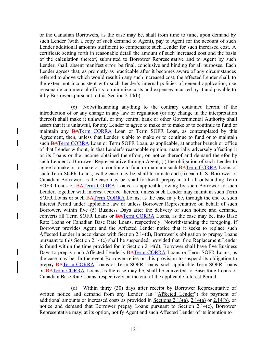 -121- or the Canadian Borrowers, as the case may be, shall from time to time, upon demand by such Lender (with a copy of such demand to Agent), pay to Agent for the account of such Lender additional amounts sufficient to compensate such Lender for such increased cost. A certificate setting forth in reasonable detail the amount of such increased cost and the basis of the calculation thereof, submitted to Borrower Representative and to Agent by such Lender, shall, absent manifest error, be final, conclusive and binding for all purposes. Each Lender agrees that, as promptly as practicable after it becomes aware of any circumstances referred to above which would result in any such increased cost, the affected Lender shall, to the extent not inconsistent with such Lender’s internal policies of general application, use reasonable commercial efforts to minimize costs and expenses incurred by it and payable to it by Borrowers pursuant to this Section 2.14(b). (c) Notwithstanding anything to the contrary contained herein, if the introduction of or any change in any law or regulation (or any change in the interpretation thereof) shall make it unlawful, or any central bank or other Governmental Authority shall assert that it is unlawful, for any Lender to agree to make or to make or to continue to fund or maintain any BATerm CORRA Loan or Term SOFR Loan, as contemplated by this Agreement, then, unless that Lender is able to make or to continue to fund or to maintain such BATerm CORRA Loan or Term SOFR Loan, as applicable, at another branch or office of that Lender without, in that Lender’s reasonable opinion, materially adversely affecting it or its Loans or the income obtained therefrom, on notice thereof and demand therefor by such Lender to Borrower Representative through Agent, (i) the obligation of such Lender to agree to make or to make or to continue to fund or maintain such BATerm CORRA Loans or such Term SOFR Loans, as the case may be, shall terminate and (ii) each U.S. Borrower or Canadian Borrower, as the case may be, shall forthwith prepay in full all outstanding Term SOFR Loans or BATerm CORRA Loans, as applicable, owing by such Borrower to such Lender, together with interest accrued thereon, unless such Lender may maintain such Term SOFR Loans or such BATerm CORRA Loans, as the case may be, through the end of such Interest Period under applicable law or unless Borrower Representative on behalf of such Borrower, within five (5) Business Days after the delivery of such notice and demand, converts all Term SOFR Loans or BATerm CORRA Loans, as the case may be, into Base Rate Loans or Canadian Base Rate Loans, respectively. Notwithstanding the foregoing, if Borrower provides Agent and the Affected Lender notice that it seeks to replace such Affected Lender in accordance with Section 2.14(d), Borrower’s obligation to prepay Loans pursuant to this Section 2.14(c) shall be suspended; provided that if no Replacement Lender is found within the time provided for in Section 2.14(d), Borrower shall have five Business Days to prepay such Affected Lender’s BATerm CORRA Loans or Term SOFR Loans, as the case may be. In the event Borrower relies on this provision to suspend its obligation to prepay BATerm CORRA Loans or Term SOFR Loans, such applicable Term SOFR Loans or BATerm CORRA Loans, as the case may be, shall be converted to Base Rate Loans or Canadian Base Rate Loans, respectively, at the end of the applicable Interest Period. (d) Within thirty (30) days after receipt by Borrower Representative of written notice and demand from any Lender (an “Affected Lender”) for payment of additional amounts or increased costs as provided in Sections 2.13(a), 2.14(a) or 2.14(b), or notice and demand that Borrower prepay Loans pursuant to Section 2.14(c), Borrower Representative may, at its option, notify Agent and such Affected Lender of its intention to