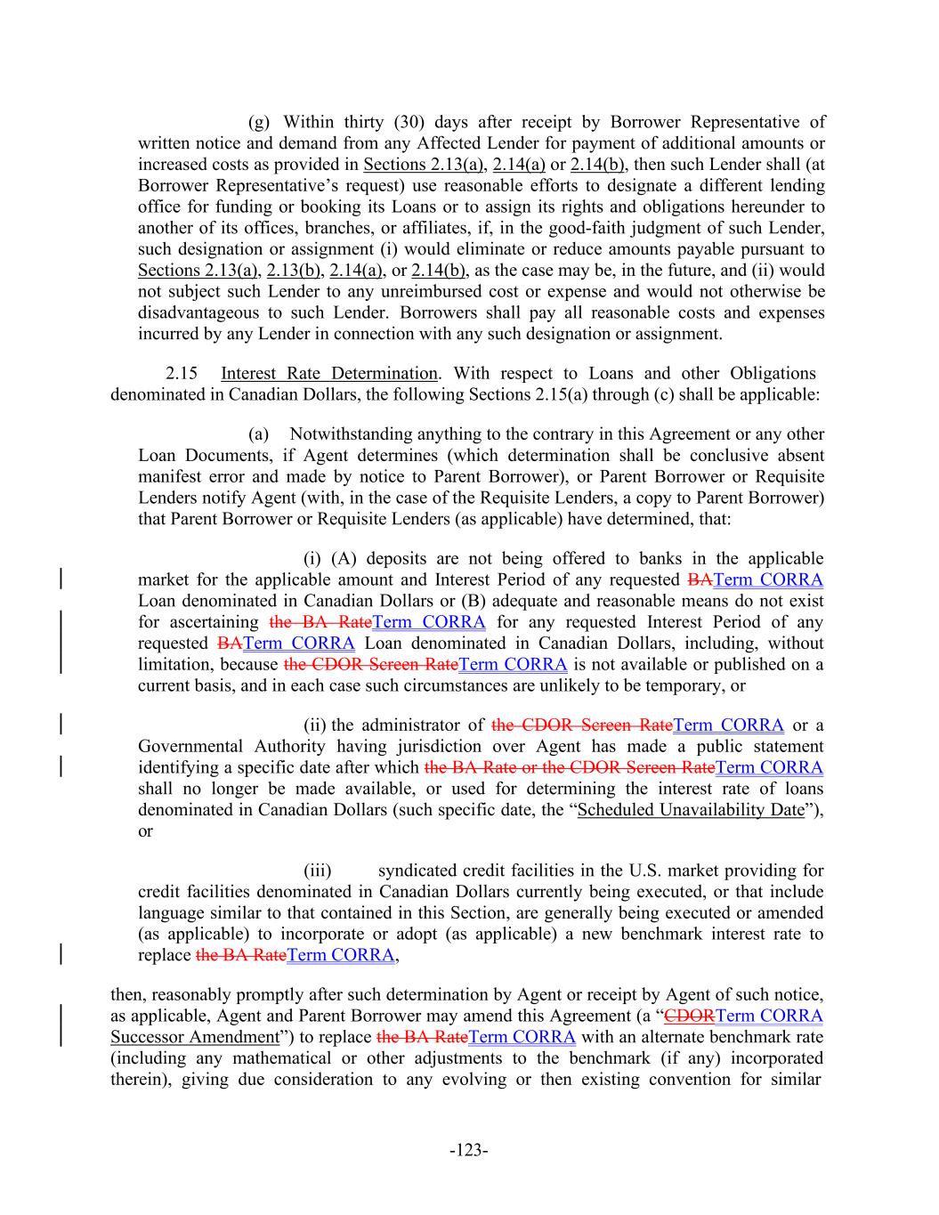 -123- (g) Within thirty (30) days after receipt by Borrower Representative of written notice and demand from any Affected Lender for payment of additional amounts or increased costs as provided in Sections 2.13(a), 2.14(a) or 2.14(b), then such Lender shall (at Borrower Representative’s request) use reasonable efforts to designate a different lending office for funding or booking its Loans or to assign its rights and obligations hereunder to another of its offices, branches, or affiliates, if, in the good-faith judgment of such Lender, such designation or assignment (i) would eliminate or reduce amounts payable pursuant to Sections 2.13(a), 2.13(b), 2.14(a), or 2.14(b), as the case may be, in the future, and (ii) would not subject such Lender to any unreimbursed cost or expense and would not otherwise be disadvantageous to such Lender. Borrowers shall pay all reasonable costs and expenses incurred by any Lender in connection with any such designation or assignment. 2.15 Interest Rate Determination. With respect to Loans and other Obligations denominated in Canadian Dollars, the following Sections 2.15(a) through (c) shall be applicable: (a) Notwithstanding anything to the contrary in this Agreement or any other Loan Documents, if Agent determines (which determination shall be conclusive absent manifest error and made by notice to Parent Borrower), or Parent Borrower or Requisite Lenders notify Agent (with, in the case of the Requisite Lenders, a copy to Parent Borrower) that Parent Borrower or Requisite Lenders (as applicable) have determined, that: (i) (A) deposits are not being offered to banks in the applicable market for the applicable amount and Interest Period of any requested BATerm CORRA Loan denominated in Canadian Dollars or (B) adequate and reasonable means do not exist for ascertaining the BA RateTerm CORRA for any requested Interest Period of any requested BATerm CORRA Loan denominated in Canadian Dollars, including, without limitation, because the CDOR Screen RateTerm CORRA is not available or published on a current basis, and in each case such circumstances are unlikely to be temporary, or (ii) the administrator of the CDOR Screen RateTerm CORRA or a Governmental Authority having jurisdiction over Agent has made a public statement identifying a specific date after which the BA Rate or the CDOR Screen RateTerm CORRA shall no longer be made available, or used for determining the interest rate of loans denominated in Canadian Dollars (such specific date, the “Scheduled Unavailability Date”), or (iii) syndicated credit facilities in the U.S. market providing for credit facilities denominated in Canadian Dollars currently being executed, or that include language similar to that contained in this Section, are generally being executed or amended (as applicable) to incorporate or adopt (as applicable) a new benchmark interest rate to replace the BA RateTerm CORRA, then, reasonably promptly after such determination by Agent or receipt by Agent of such notice, as applicable, Agent and Parent Borrower may amend this Agreement (a “CDORTerm CORRA Successor Amendment”) to replace the BA RateTerm CORRA with an alternate benchmark rate (including any mathematical or other adjustments to the benchmark (if any) incorporated therein), giving due consideration to any evolving or then existing convention for similar