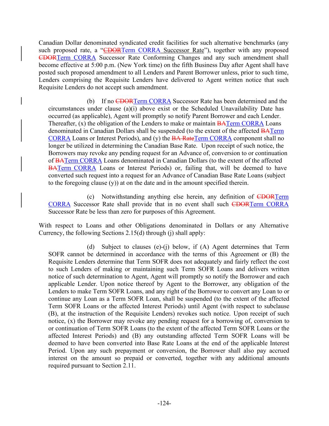 -124- Canadian Dollar denominated syndicated credit facilities for such alternative benchmarks (any such proposed rate, a “CDORTerm CORRA Successor Rate”), together with any proposed CDORTerm CORRA Successor Rate Conforming Changes and any such amendment shall become effective at 5:00 p.m. (New York time) on the fifth Business Day after Agent shall have posted such proposed amendment to all Lenders and Parent Borrower unless, prior to such time, Lenders comprising the Requisite Lenders have delivered to Agent written notice that such Requisite Lenders do not accept such amendment. (b) If no CDORTerm CORRA Successor Rate has been determined and the circumstances under clause (a)(i) above exist or the Scheduled Unavailability Date has occurred (as applicable), Agent will promptly so notify Parent Borrower and each Lender. Thereafter, (x) the obligation of the Lenders to make or maintain BATerm CORRA Loans denominated in Canadian Dollars shall be suspended (to the extent of the affected BATerm CORRA Loans or Interest Periods), and (y) the BA RateTerm CORRA component shall no longer be utilized in determining the Canadian Base Rate. Upon receipt of such notice, the Borrowers may revoke any pending request for an Advance of, conversion to or continuation of BATerm CORRA Loans denominated in Canadian Dollars (to the extent of the affected BATerm CORRA Loans or Interest Periods) or, failing that, will be deemed to have converted such request into a request for an Advance of Canadian Base Rate Loans (subject to the foregoing clause (y)) at on the date and in the amount specified therein. (c) Notwithstanding anything else herein, any definition of CDORTerm CORRA Successor Rate shall provide that in no event shall such CDORTerm CORRA Successor Rate be less than zero for purposes of this Agreement. With respect to Loans and other Obligations denominated in Dollars or any Alternative Currency, the following Sections 2.15(d) through (j) shall apply: (d) Subject to clauses (e)-(j) below, if (A) Agent determines that Term SOFR cannot be determined in accordance with the terms of this Agreement or (B) the Requisite Lenders determine that Term SOFR does not adequately and fairly reflect the cost to such Lenders of making or maintaining such Term SOFR Loans and delivers written notice of such determination to Agent, Agent will promptly so notify the Borrower and each applicable Lender. Upon notice thereof by Agent to the Borrower, any obligation of the Lenders to make Term SOFR Loans, and any right of the Borrower to convert any Loan to or continue any Loan as a Term SOFR Loan, shall be suspended (to the extent of the affected Term SOFR Loans or the affected Interest Periods) until Agent (with respect to subclause (B), at the instruction of the Requisite Lenders) revokes such notice. Upon receipt of such notice, (x) the Borrower may revoke any pending request for a borrowing of, conversion to or continuation of Term SOFR Loans (to the extent of the affected Term SOFR Loans or the affected Interest Periods) and (B) any outstanding affected Term SOFR Loans will be deemed to have been converted into Base Rate Loans at the end of the applicable Interest Period. Upon any such prepayment or conversion, the Borrower shall also pay accrued interest on the amount so prepaid or converted, together with any additional amounts required pursuant to Section 2.11.