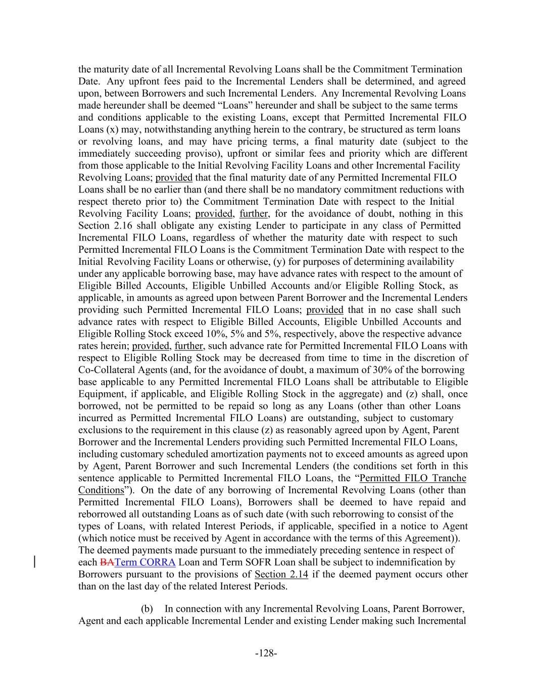 -128- the maturity date of all Incremental Revolving Loans shall be the Commitment Termination Date. Any upfront fees paid to the Incremental Lenders shall be determined, and agreed upon, between Borrowers and such Incremental Lenders. Any Incremental Revolving Loans made hereunder shall be deemed “Loans” hereunder and shall be subject to the same terms and conditions applicable to the existing Loans, except that Permitted Incremental FILO Loans (x) may, notwithstanding anything herein to the contrary, be structured as term loans or revolving loans, and may have pricing terms, a final maturity date (subject to the immediately succeeding proviso), upfront or similar fees and priority which are different from those applicable to the Initial Revolving Facility Loans and other Incremental Facility Revolving Loans; provided that the final maturity date of any Permitted Incremental FILO Loans shall be no earlier than (and there shall be no mandatory commitment reductions with respect thereto prior to) the Commitment Termination Date with respect to the Initial Revolving Facility Loans; provided, further, for the avoidance of doubt, nothing in this Section 2.16 shall obligate any existing Lender to participate in any class of Permitted Incremental FILO Loans, regardless of whether the maturity date with respect to such Permitted Incremental FILO Loans is the Commitment Termination Date with respect to the Initial Revolving Facility Loans or otherwise, (y) for purposes of determining availability under any applicable borrowing base, may have advance rates with respect to the amount of Eligible Billed Accounts, Eligible Unbilled Accounts and/or Eligible Rolling Stock, as applicable, in amounts as agreed upon between Parent Borrower and the Incremental Lenders providing such Permitted Incremental FILO Loans; provided that in no case shall such advance rates with respect to Eligible Billed Accounts, Eligible Unbilled Accounts and Eligible Rolling Stock exceed 10%, 5% and 5%, respectively, above the respective advance rates herein; provided, further, such advance rate for Permitted Incremental FILO Loans with respect to Eligible Rolling Stock may be decreased from time to time in the discretion of Co-Collateral Agents (and, for the avoidance of doubt, a maximum of 30% of the borrowing base applicable to any Permitted Incremental FILO Loans shall be attributable to Eligible Equipment, if applicable, and Eligible Rolling Stock in the aggregate) and (z) shall, once borrowed, not be permitted to be repaid so long as any Loans (other than other Loans incurred as Permitted Incremental FILO Loans) are outstanding, subject to customary exclusions to the requirement in this clause (z) as reasonably agreed upon by Agent, Parent Borrower and the Incremental Lenders providing such Permitted Incremental FILO Loans, including customary scheduled amortization payments not to exceed amounts as agreed upon by Agent, Parent Borrower and such Incremental Lenders (the conditions set forth in this sentence applicable to Permitted Incremental FILO Loans, the “Permitted FILO Tranche Conditions”). On the date of any borrowing of Incremental Revolving Loans (other than Permitted Incremental FILO Loans), Borrowers shall be deemed to have repaid and reborrowed all outstanding Loans as of such date (with such reborrowing to consist of the types of Loans, with related Interest Periods, if applicable, specified in a notice to Agent (which notice must be received by Agent in accordance with the terms of this Agreement)). The deemed payments made pursuant to the immediately preceding sentence in respect of each BATerm CORRA Loan and Term SOFR Loan shall be subject to indemnification by Borrowers pursuant to the provisions of Section 2.14 if the deemed payment occurs other than on the last day of the related Interest Periods. (b) In connection with any Incremental Revolving Loans, Parent Borrower, Agent and each applicable Incremental Lender and existing Lender making such Incremental