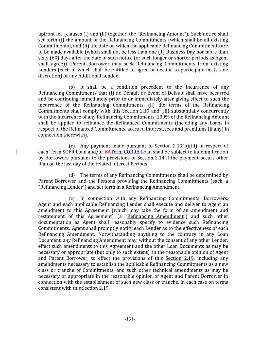 -131- upfront fee (clauses (i) and (ii) together, the “Refinancing Amount”). Such notice shall set forth (i) the amount of the Refinancing Commitments (which shall be all existing Commitments), and (ii) the date on which the applicable Refinancing Commitments are to be made available (which shall not be less than one (1) Business Day nor more than sixty (60) days after the date of such notice (or such longer or shorter periods as Agent shall agree)). Parent Borrower may seek Refinancing Commitments from existing Lenders (each of which shall be entitled to agree or decline to participate in its sole discretion) or any Additional Lender. (b) It shall be a condition precedent to the incurrence of any Refinancing Commitments that (i) no Default or Event of Default shall have occurred and be continuing immediately prior to or immediately after giving effect to such the incurrence of the Refinancing Commitments, (ii) the terms of the Refinancing Commitments shall comply with this Section 2.19 and (iii) substantially concurrently with the incurrence of any Refinancing Commitments, 100% of the Refinancing Amount shall be applied to refinance the Refinanced Commitments (including any Loans in respect of the Refinanced Commitments, accrued interest, fees and premiums (if any) in connection therewith). (c) Any payment made pursuant to Section 2.19(b)(iii) in respect of each Term SOFR Loan and/or BATerm CORRA Loan shall be subject to indemnification by Borrowers pursuant to the provisions of Section 2.14 if the payment occurs other than on the last day of the related Interest Periods. (d) The terms of any Refinancing Commitments shall be determined by Parent Borrower and the Persons providing the Refinancing Commitments (each, a “Refinancing Lender”) and set forth in a Refinancing Amendment. (e) In connection with any Refinancing Commitments, Borrowers, Agent and each applicable Refinancing Lender shall execute and deliver to Agent an amendment to this Agreement (which may take the form of an amendment and restatement of this Agreement) (a “Refinancing Amendment”) and such other documentation as Agent shall reasonably specify to evidence such Refinancing Commitments. Agent shall promptly notify each Lender as to the effectiveness of each Refinancing Amendment. Notwithstanding anything to the contrary in any Loan Document, any Refinancing Amendment may, without the consent of any other Lender, effect such amendments to this Agreement and the other Loan Documents as may be necessary or appropriate (but only to such extent), in the reasonable opinion of Agent and Parent Borrower, to effect the provisions of this Section 2.19, including any amendments necessary to establish the applicable Refinancing Commitments as a new class or tranche of Commitments, and such other technical amendments as may be necessary or appropriate in the reasonable opinion of Agent and Parent Borrower in connection with the establishment of such new class or tranche, in each case on terms consistent with this Section 2.19.