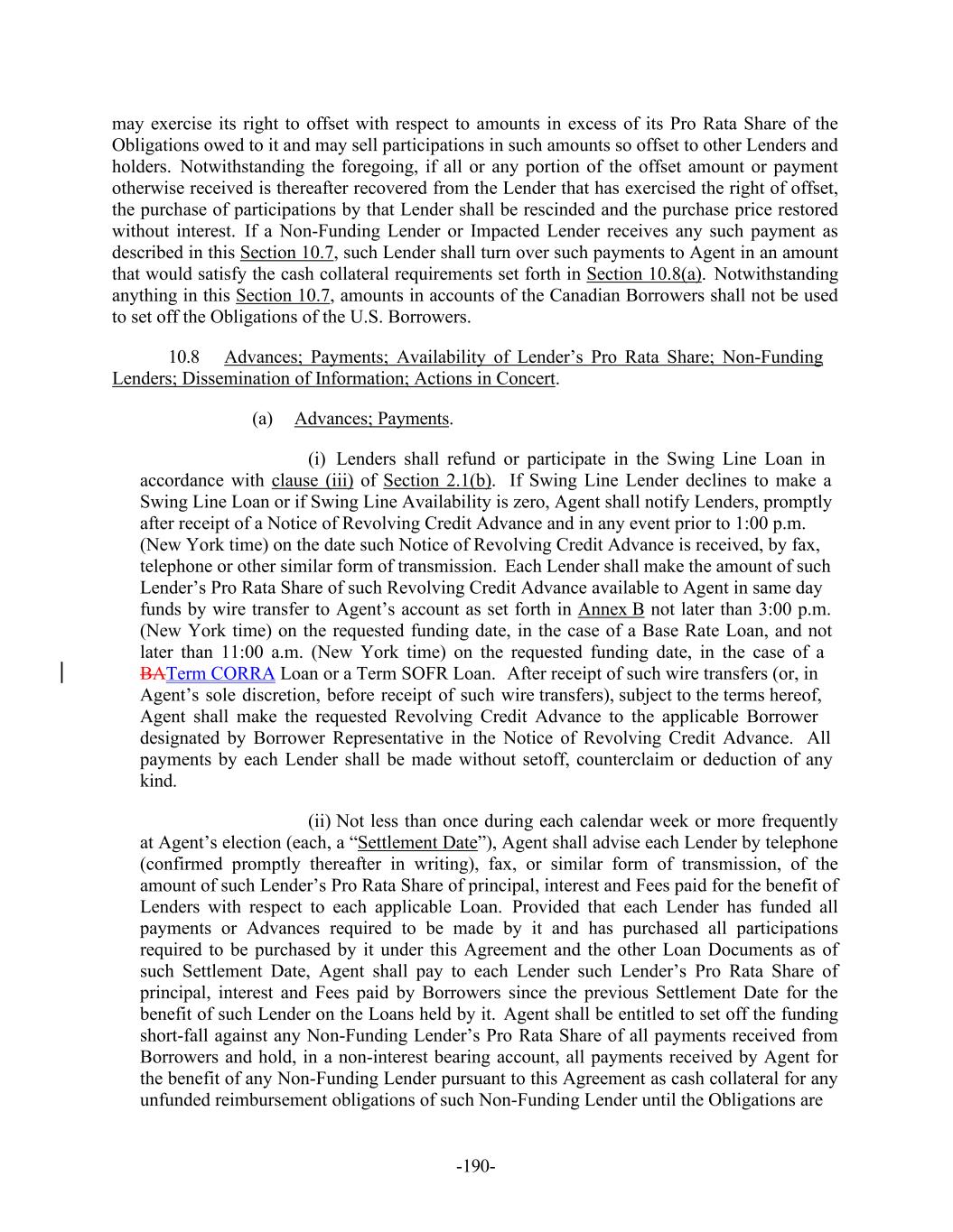 -190- may exercise its right to offset with respect to amounts in excess of its Pro Rata Share of the Obligations owed to it and may sell participations in such amounts so offset to other Lenders and holders. Notwithstanding the foregoing, if all or any portion of the offset amount or payment otherwise received is thereafter recovered from the Lender that has exercised the right of offset, the purchase of participations by that Lender shall be rescinded and the purchase price restored without interest. If a Non-Funding Lender or Impacted Lender receives any such payment as described in this Section 10.7, such Lender shall turn over such payments to Agent in an amount that would satisfy the cash collateral requirements set forth in Section 10.8(a). Notwithstanding anything in this Section 10.7, amounts in accounts of the Canadian Borrowers shall not be used to set off the Obligations of the U.S. Borrowers. 10.8 Advances; Payments; Availability of Lender’s Pro Rata Share; Non-Funding Lenders; Dissemination of Information; Actions in Concert. (a) Advances; Payments. (i) Lenders shall refund or participate in the Swing Line Loan in accordance with clause (iii) of Section 2.1(b). If Swing Line Lender declines to make a Swing Line Loan or if Swing Line Availability is zero, Agent shall notify Lenders, promptly after receipt of a Notice of Revolving Credit Advance and in any event prior to 1:00 p.m. (New York time) on the date such Notice of Revolving Credit Advance is received, by fax, telephone or other similar form of transmission. Each Lender shall make the amount of such Lender’s Pro Rata Share of such Revolving Credit Advance available to Agent in same day funds by wire transfer to Agent’s account as set forth in Annex B not later than 3:00 p.m. (New York time) on the requested funding date, in the case of a Base Rate Loan, and not later than 11:00 a.m. (New York time) on the requested funding date, in the case of a BATerm CORRA Loan or a Term SOFR Loan. After receipt of such wire transfers (or, in Agent’s sole discretion, before receipt of such wire transfers), subject to the terms hereof, Agent shall make the requested Revolving Credit Advance to the applicable Borrower designated by Borrower Representative in the Notice of Revolving Credit Advance. All payments by each Lender shall be made without setoff, counterclaim or deduction of any kind. (ii) Not less than once during each calendar week or more frequently at Agent’s election (each, a “Settlement Date”), Agent shall advise each Lender by telephone (confirmed promptly thereafter in writing), fax, or similar form of transmission, of the amount of such Lender’s Pro Rata Share of principal, interest and Fees paid for the benefit of Lenders with respect to each applicable Loan. Provided that each Lender has funded all payments or Advances required to be made by it and has purchased all participations required to be purchased by it under this Agreement and the other Loan Documents as of such Settlement Date, Agent shall pay to each Lender such Lender’s Pro Rata Share of principal, interest and Fees paid by Borrowers since the previous Settlement Date for the benefit of such Lender on the Loans held by it. Agent shall be entitled to set off the funding short-fall against any Non-Funding Lender’s Pro Rata Share of all payments received from Borrowers and hold, in a non-interest bearing account, all payments received by Agent for the benefit of any Non-Funding Lender pursuant to this Agreement as cash collateral for any unfunded reimbursement obligations of such Non-Funding Lender until the Obligations are
