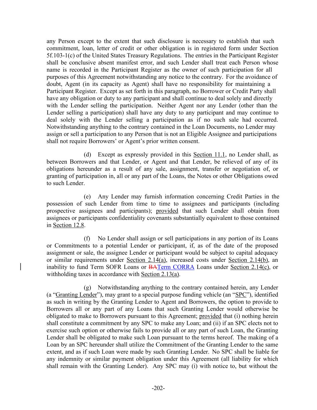 -202- any Person except to the extent that such disclosure is necessary to establish that such commitment, loan, letter of credit or other obligation is in registered form under Section 5f.103-1(c) of the United States Treasury Regulations. The entries in the Participant Register shall be conclusive absent manifest error, and such Lender shall treat each Person whose name is recorded in the Participant Register as the owner of such participation for all purposes of this Agreement notwithstanding any notice to the contrary. For the avoidance of doubt, Agent (in its capacity as Agent) shall have no responsibility for maintaining a Participant Register. Except as set forth in this paragraph, no Borrower or Credit Party shall have any obligation or duty to any participant and shall continue to deal solely and directly with the Lender selling the participation. Neither Agent nor any Lender (other than the Lender selling a participation) shall have any duty to any participant and may continue to deal solely with the Lender selling a participation as if no such sale had occurred. Notwithstanding anything to the contrary contained in the Loan Documents, no Lender may assign or sell a participation to any Person that is not an Eligible Assignee and participations shall not require Borrowers’ or Agent’s prior written consent. (d) Except as expressly provided in this Section 11.1, no Lender shall, as between Borrowers and that Lender, or Agent and that Lender, be relieved of any of its obligations hereunder as a result of any sale, assignment, transfer or negotiation of, or granting of participation in, all or any part of the Loans, the Notes or other Obligations owed to such Lender. (e) Any Lender may furnish information concerning Credit Parties in the possession of such Lender from time to time to assignees and participants (including prospective assignees and participants); provided that such Lender shall obtain from assignees or participants confidentiality covenants substantially equivalent to those contained in Section 12.8. (f) No Lender shall assign or sell participations in any portion of its Loans or Commitments to a potential Lender or participant, if, as of the date of the proposed assignment or sale, the assignee Lender or participant would be subject to capital adequacy or similar requirements under Section 2.14(a), increased costs under Section 2.14(b), an inability to fund Term SOFR Loans or BATerm CORRA Loans under Section 2.14(c), or withholding taxes in accordance with Section 2.13(a). (g) Notwithstanding anything to the contrary contained herein, any Lender (a “Granting Lender”), may grant to a special purpose funding vehicle (an “SPC”), identified as such in writing by the Granting Lender to Agent and Borrowers, the option to provide to Borrowers all or any part of any Loans that such Granting Lender would otherwise be obligated to make to Borrowers pursuant to this Agreement; provided that (i) nothing herein shall constitute a commitment by any SPC to make any Loan; and (ii) if an SPC elects not to exercise such option or otherwise fails to provide all or any part of such Loan, the Granting Lender shall be obligated to make such Loan pursuant to the terms hereof. The making of a Loan by an SPC hereunder shall utilize the Commitment of the Granting Lender to the same extent, and as if such Loan were made by such Granting Lender. No SPC shall be liable for any indemnity or similar payment obligation under this Agreement (all liability for which shall remain with the Granting Lender). Any SPC may (i) with notice to, but without the